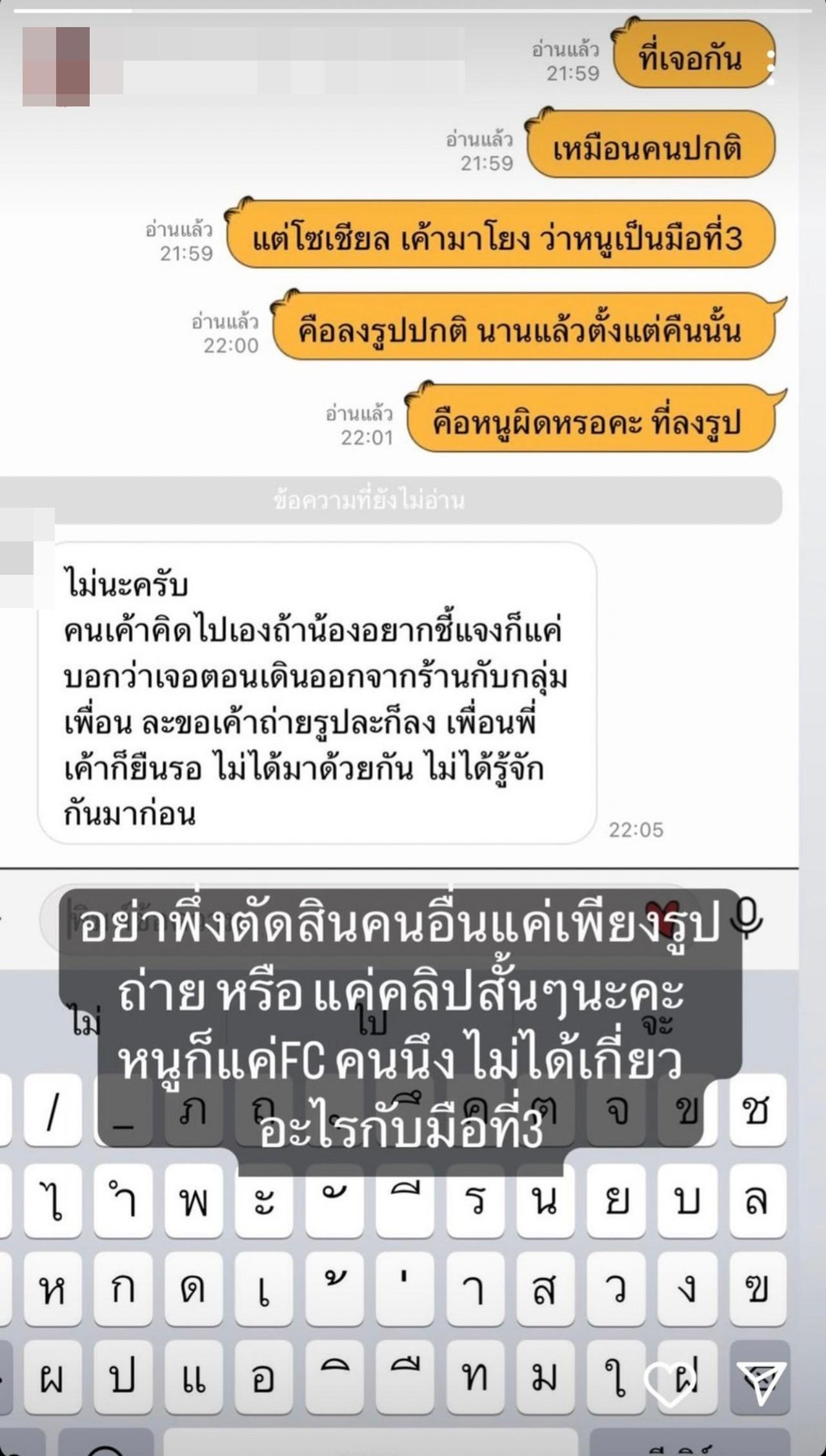 และนอกจากนี้ยังมีข้อความที่แชตคุยกันอยู่ด้วย "ที่เจอกัน เหมือนคนปกติ แต่โซเชียลเค้ามาโยงว่าหนูเป็นมือที่ 3 คือลงรูปปกติ นานแล้วตั้งแต่คืนนั้น คือหนูผิดหรอคะที่ลงรูป" ซึ่งก็มีข้อความตอบกลับมาว่า "ไม่นะครับ คนเค้าคิดไปเอง ถ้าน้องอยากชี้แจงก็แค่บอกว่าเจอตอนเดินออกจากร้านกับกลุ่มเพื่อน ละขอเค้าถ่ายรูปละก็ลง เพื่อนพี่เค้าก็ยืนรอ ไม่ได้มาด้วยกัน ไม่ได้รู้จักกันมาก่อน"