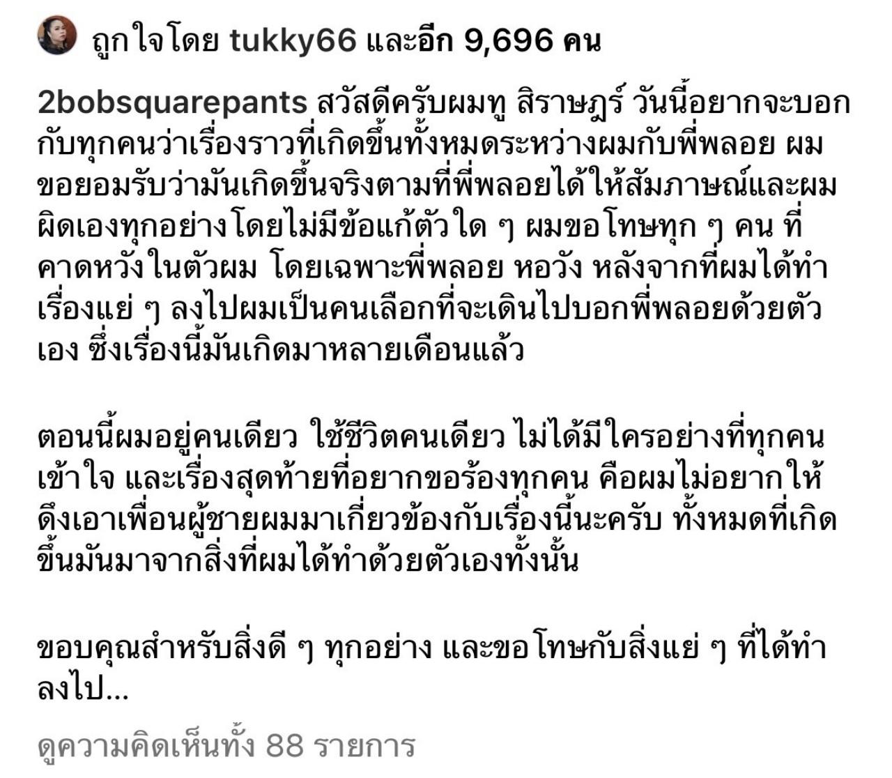 "สวัสดีครับผมทู สิราษฎร์ วันนี้อยากจะบอกกับทุกคนว่าเรื่องราวที่เกิดขึ้นทั้งหมดระหว่างผมกับพี่พลอย ผมขอยอมรับว่ามันเกิดขึ้นจริงตามที่พี่พลอยได้ให้สัมภาษณ์และผมผิดเองทุกอย่างโดยไม่มีข้อแก้ตัวใดๆ