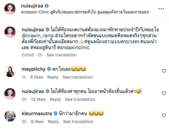 งานนี้ทำให้เหล่าคนบันเทิงต่างเข้ามาร่วมแสดงความยินดีกันเป็นจำนวนมาก เพราะคิดว่าคุณแม่กำลังจะประกาศข่าวดีตั้งท้องลูกอีกคน ก่อนจะมาได้อ่านแคปชั่นที่ นุ้ย สุจิรา ได้เขียนชี้แจงเอาไว้ โดยระบุข้อความดังกล่าวว่า