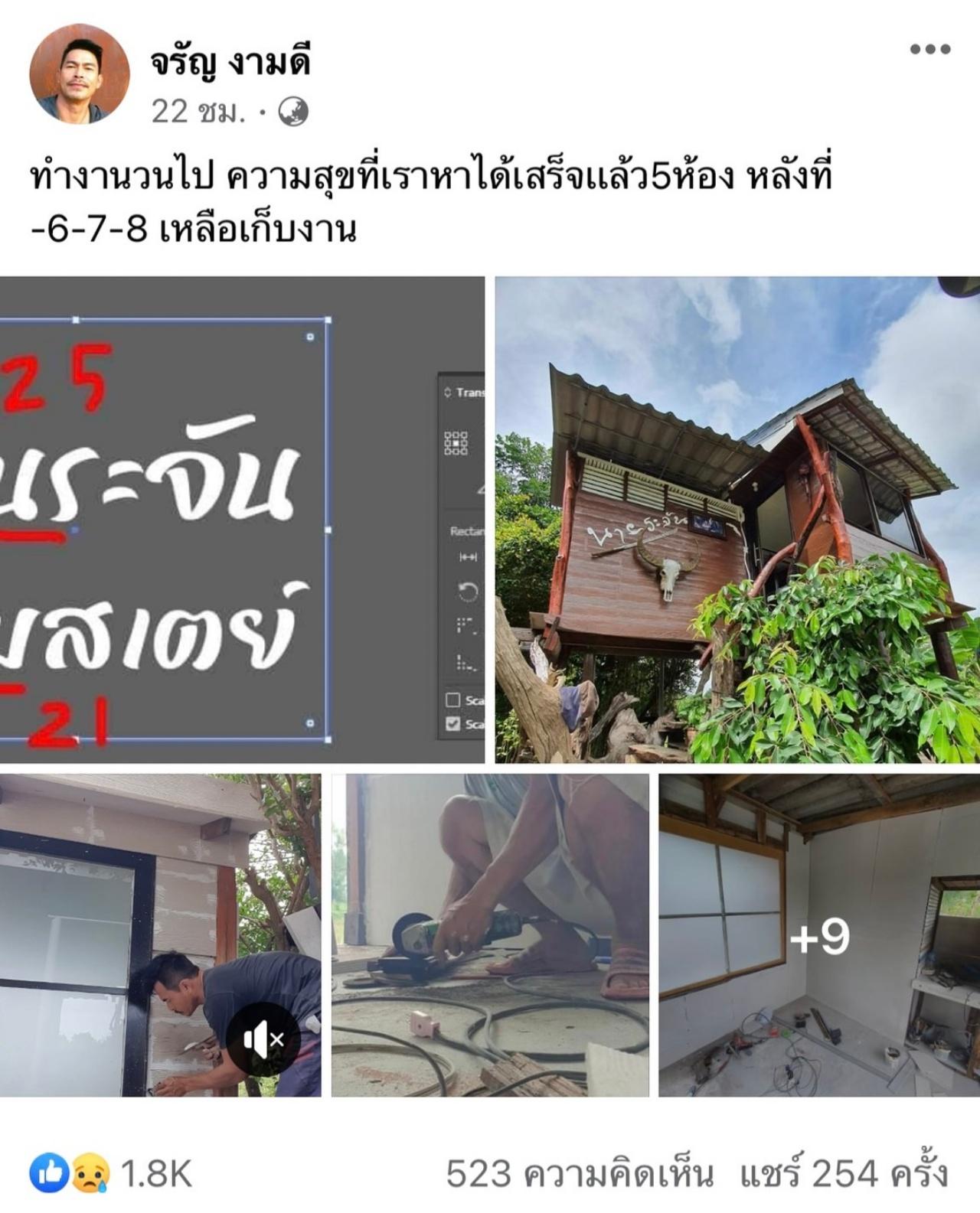 ซึ่งเมื่อเข้าไปดูเฟซบุ๊กของ จรัญ งามดี ก็ได้พบว่าก่อนหน้าที่จะเสียชีวิต ได้โพสต์รูปที่กำลังต่อเติมรีสอร์ตของตัวเอง โดยเขียนแคปชั่นประกอบภาพที่เจ้าตัวได้โพสต์เอาไว้ว่า “ทำงานวนไป ความสุขที่เราหาได้เสร็จเเล้ว5ห้อง หลังที่ -6-7-8 เหลือเก็บงาน”