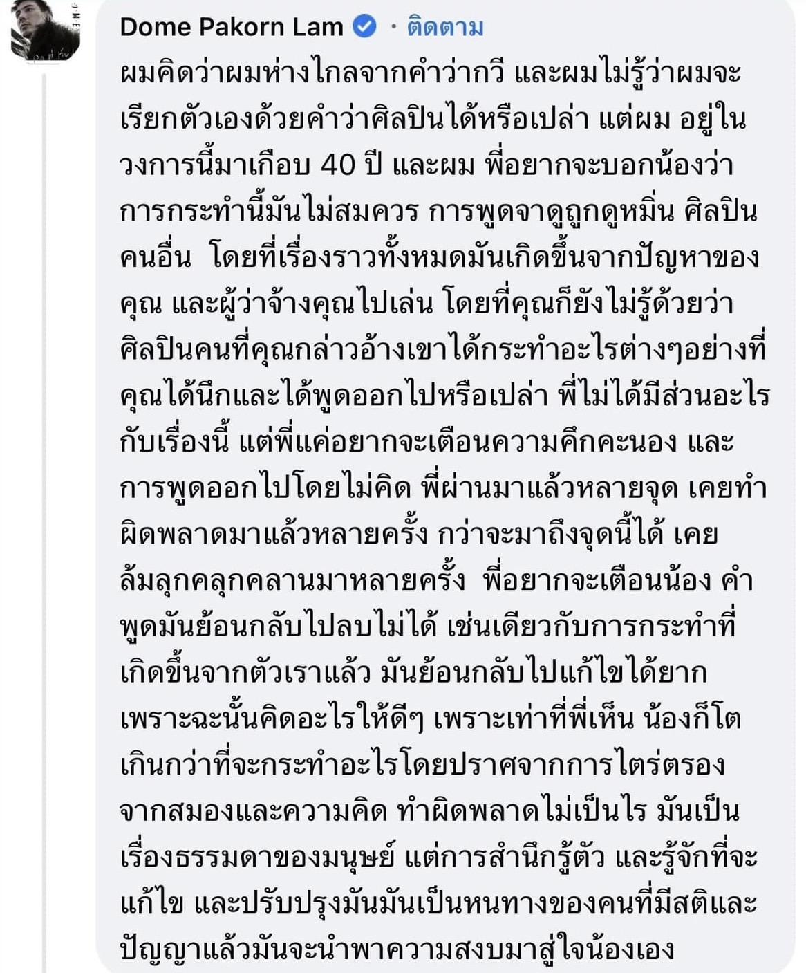 และผม พี่อยากจะบอกน้องว่า การกระทำนี้มันไม่สมควร การพูดจาดูถูกดูหมิ่น ศิลปินคนอื่น โดยที่เรื่องราวทั้งหมด มันเกิดขึ้นจากปัญหาของคุณ และผู้ว่าจ้างคุณไปเล่น โดยที่คุณก็ยังไม่รู้ด้วยว่าศิลปินคนที่คุณกล่าวอ้าง เขาได้กระทำอะไรต่างๆ อย่างที่คุณได้นึกและได้พูดออกไปหรือเปล่า
