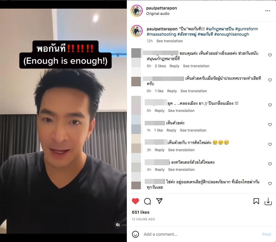 ล่าสุดอดีตพระเอกดัง พอล ภัทรพล ศิลปาจารย์ ได้แสดงความคิดเห็นด้วยการอัดคลิปลงใน TikTok และไอจีส่วนตัว โดยพูดถึงเหตุผลที่ควรแก้กฎหมายปืนในประเทศไทย เขียนแคปชั่นว่า ““ปืน” พอกันที ! #แก้กฎหมายปืน #massshoootings #การสังหารหมู่ #พอกันที #อย่าให้คนตายฟรี #gunreform #พอลภัทรพล #เพื่ออนาคตของเรา”