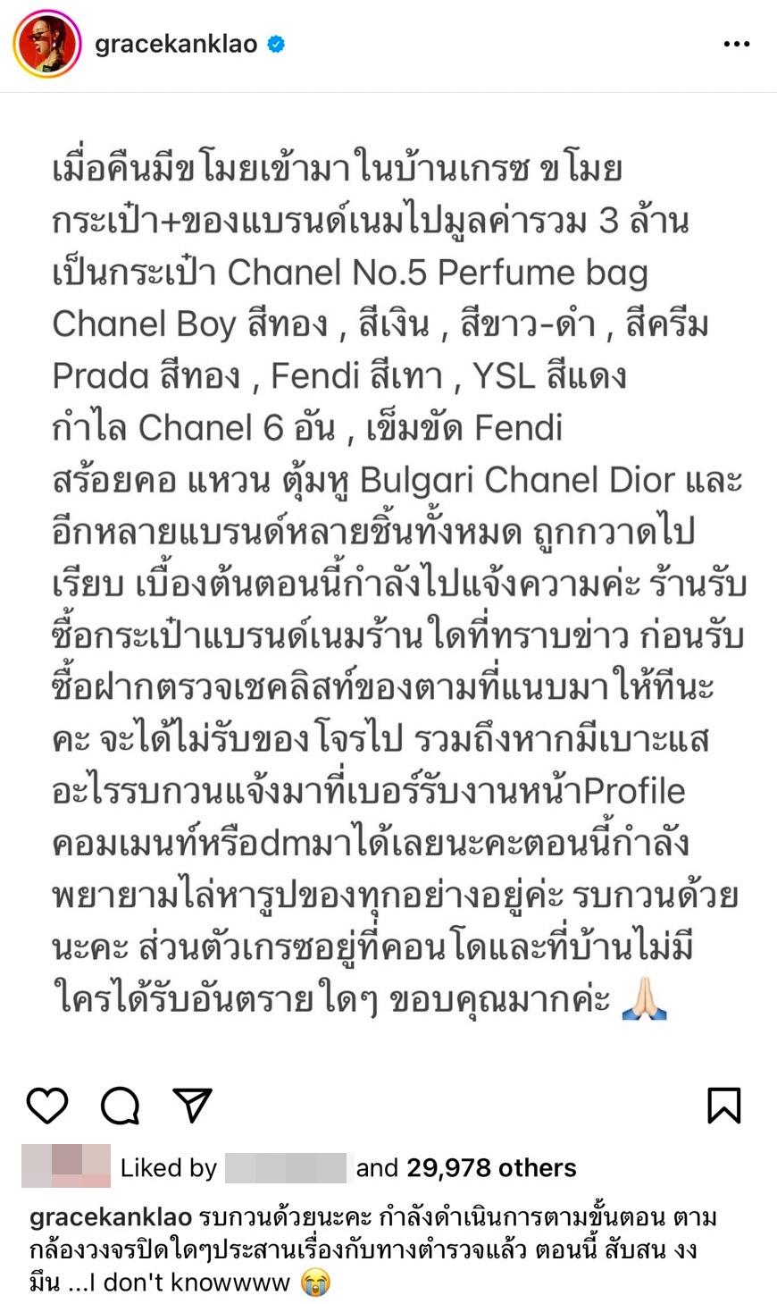 ซึ่งในภาพข้อความนี้เขียนว่า “เมื่อคืนมีขโมยเข้ามาในบ้านเกรซ ขโมยกระเป๋า+ของแบรนด์เนมไปมูลค่ารวม 3 ล้าน เป็นกระเป๋า Chanel No.5 Perfume bag Chanel Boy สีทอง, สีเงิน, สีขาว-ดำ, สีครีม Prada สีทอง, Fendi สีเทา, YSL สีแดง, กำไล Chanel 6 อัน, เข็มขัด Fendi, สร้อยคอ แหวน ตุ้มหู Bulgari Chanel Dior และอีกหลายแบรนด์หลายชิ้นทั้งหมด ถูกกวาดไปเรียบ