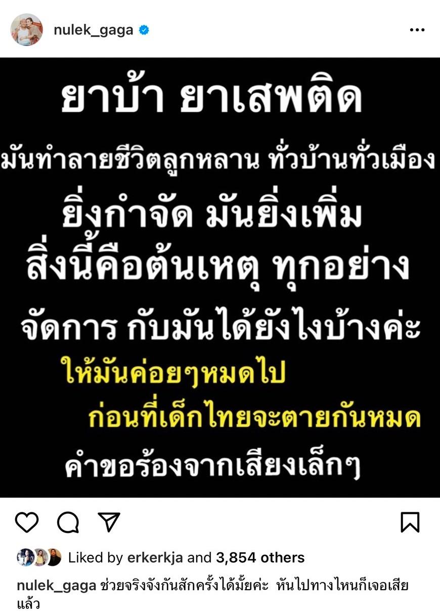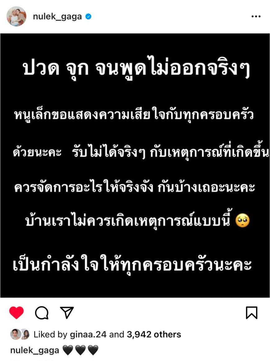 ซึ่งก่อนหน้านี้ในไอจีส่วนตัวของหนูเล็กก็ได้โพสต์ข้อความแสดงความเสียใจกับทุกครอบครัวที่ประสบเหตุ ก่อนจะโพสต์แสดงความคิดเห็นถึงเรื่องยาเสพติดไว้ว่า “ยาบ้า ยาเสพติด มันทำลายชีวิตลูกหลานทั่วบ้านทั่วเมือง ยิ่งกำจัด มันยิ่งเพิ่ม สิ่งนี้คือต้นเหตุทุกอย่าง จัดการกับมันได้ยังไงบ้างคะ ให้มันค่อยๆ หมดไป ก่อนที่เด็กไทยจะตายกันหมด คำขอร้องจากเสียงเล็กๆ” พร้อมทั้งเขียนแคปชั่น “ช่วยจริงจังกันสักครั้งได้มั้ยค่ะ หันไปทางไหนก็เจอเสียแล้ว”.