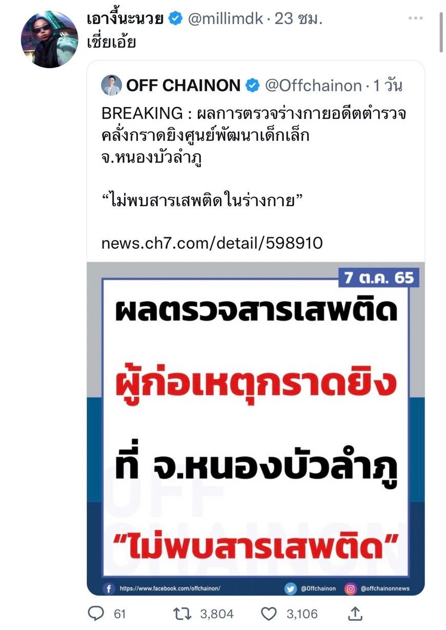 หลังจากที่แร็ปเปอร์สาว มิลลิ ดนุภา คณาธีรกุล หรือ MILLI ทวีตข้อความสุดเดือดในทวิตเตอร์ไว้ว่า “ไปก็ไปเป็นภาระ ไม่ได้ช่วยเยียวยาจิตใจครอบครัวผู้เสียชีวิตเลยสักนิด” ก่อนจะ Quote Tweet ข่าวเรื่องผลการตรวจหาสารเสพติดในตัวผู้ก่อเหตุกราดยิงหนองบัวลำภูที่ระบุว่าไม่พบสารเสพติด พร้อมทั้งทวีตแสดงความคิดเห็นว่า “เชี่-เอ้ย”