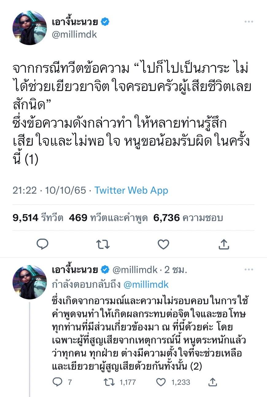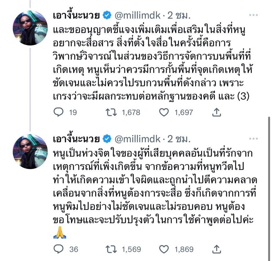 ล่าสุด มิลลิ ได้ทวีตขอโทษและชี้แจงถึงเรื่องดังกล่าว โดยบอกว่า “จากกรณีทวีตข้อความ “ไปก็ไปเป็นภาระ ไม่ได้ช่วยเยียวยาจิตใจครอบครัวผู้เสียชีวิตเลยสักนิด” ซึ่งข้อความดังกล่าวทำให้หลายท่านรู้สึกเสียใจและไม่พอใจ หนูขอน้อมรับผิดในครั้งนี้