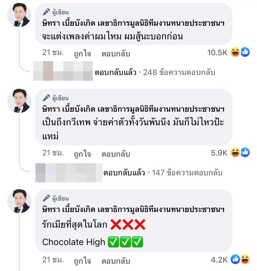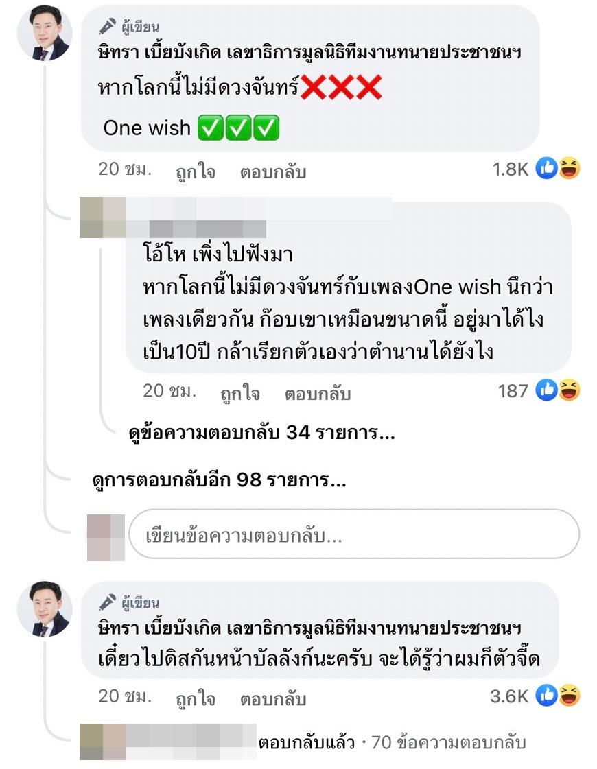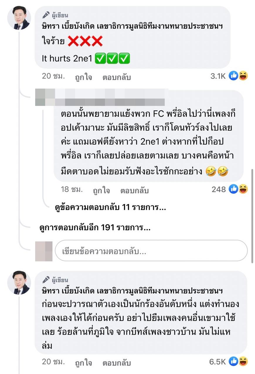 แต่ที่จี๊ดกว่านั้น เห็นจะเป็นคอมเมนต์ใต้ภาพจากทนายตั้มหลายข้อความ อาทิ จะแต่งเพลงด่าผมไหม ผมสู้นะบอกก่อน, เป็นถึงกวีเทพ จ่ายค่าตัวทั้งวันพันนึง มันก็ไม่ไหวป้ะ แหม่, ก่อนจะปวารณาตัวเองเป็นนักร้องอันดับหนึ่ง แต่งทำนองเพลงเองให้ได้ก่อนครับ อย่าไปยืมเพลงคนอื่นเขามาใช้เลย ร้อยล้านที่ภูมิใจ จากบีทส์เพลงชาวบ้าน มันไม่แหล่ม, เดี๋ยวไปดิสกันหน้าบัลลังก์นะครับ จะได้รู้ว่าผมก็ตัวจี๊ด