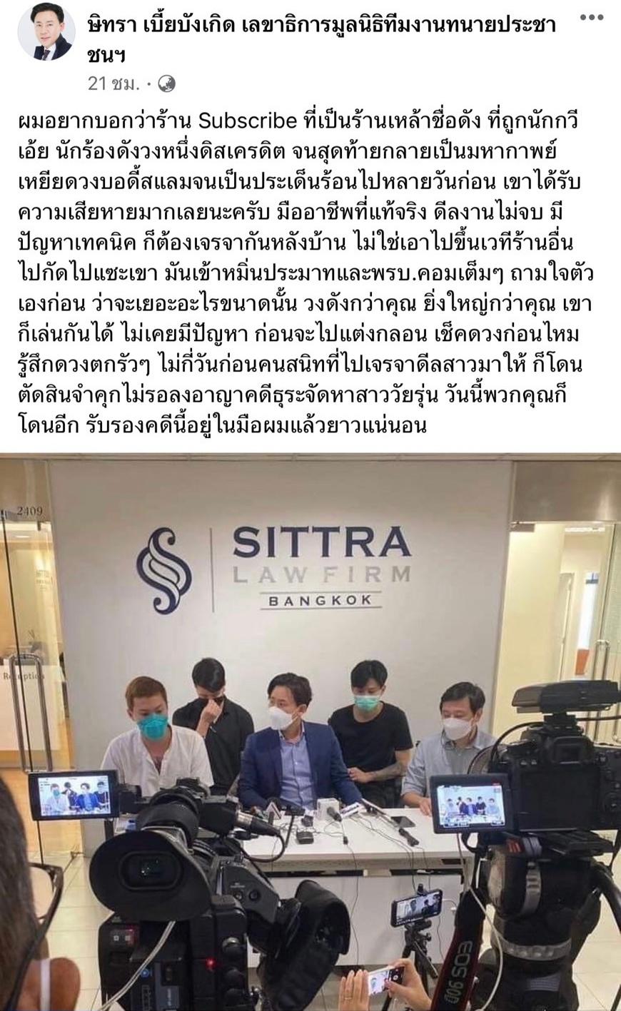 ซึ่งหลังจากการแถลงข่าวเสร็จสิ้น ทนายตั้มก็ได้โพสต์ภาพการแถลงข่าวและข้อความถึงนักร้องหนุ่มว่า “ผมอยากบอกว่าร้าน Subscribe ที่เป็นร้านเหล้าชื่อดัง ที่ถูกนักกวี เอ้ย นักร้องดังวงหนึ่งดิสเครดิต จนสุดท้ายกลายเป็นมหากาพย์เหยียดวงบอดี้สแลมจนเป็นประเด็นร้อนไปหลายวันก่อน เขาได้รับความเสียหายมากเลยนะครับ มืออาชีพที่แท้จริง ดีลงานไม่จบ มีปัญหาเทคนิค ก็ต้องเจรจากันหลังบ้าน ไม่ใช่เอาไปขึ้นเวทีร้านอื่น ไปกัดไปแซะเขา มันเข้าหมิ่นประมาทและ พรบ.คอมเต็มๆ