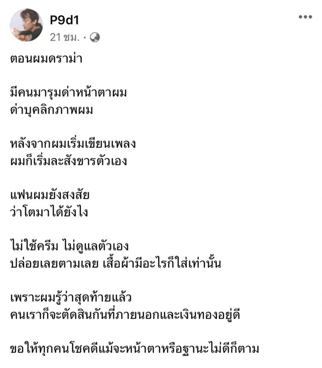 "ตอนผมดราม่ามีคนมารุมด่าหน้าตาผม ด่าบุคลิกภาพผม หลังจากผมเริ่มเขียนเพลง ผมก็เริ่มละสังขารตัวเอง แฟนผมยังสงสัยว่าโตมาได้ยังไง ไม่ใช้ครีม ไม่ดูแลตัวเอง ปล่อยเลยตามเลย เสื้อผ้ามีอะไรก็ใส่เท่านั้น เพราะผมรู้ว่าสุดท้ายแล้ว คนเราก็จะตัดสินกันที่ภายนอกและเงินทองอยู่ดี ขอให้ทุกคนโชคดีแม้จะหน้าตาหรือฐานะไม่ดีก็ตาม"
