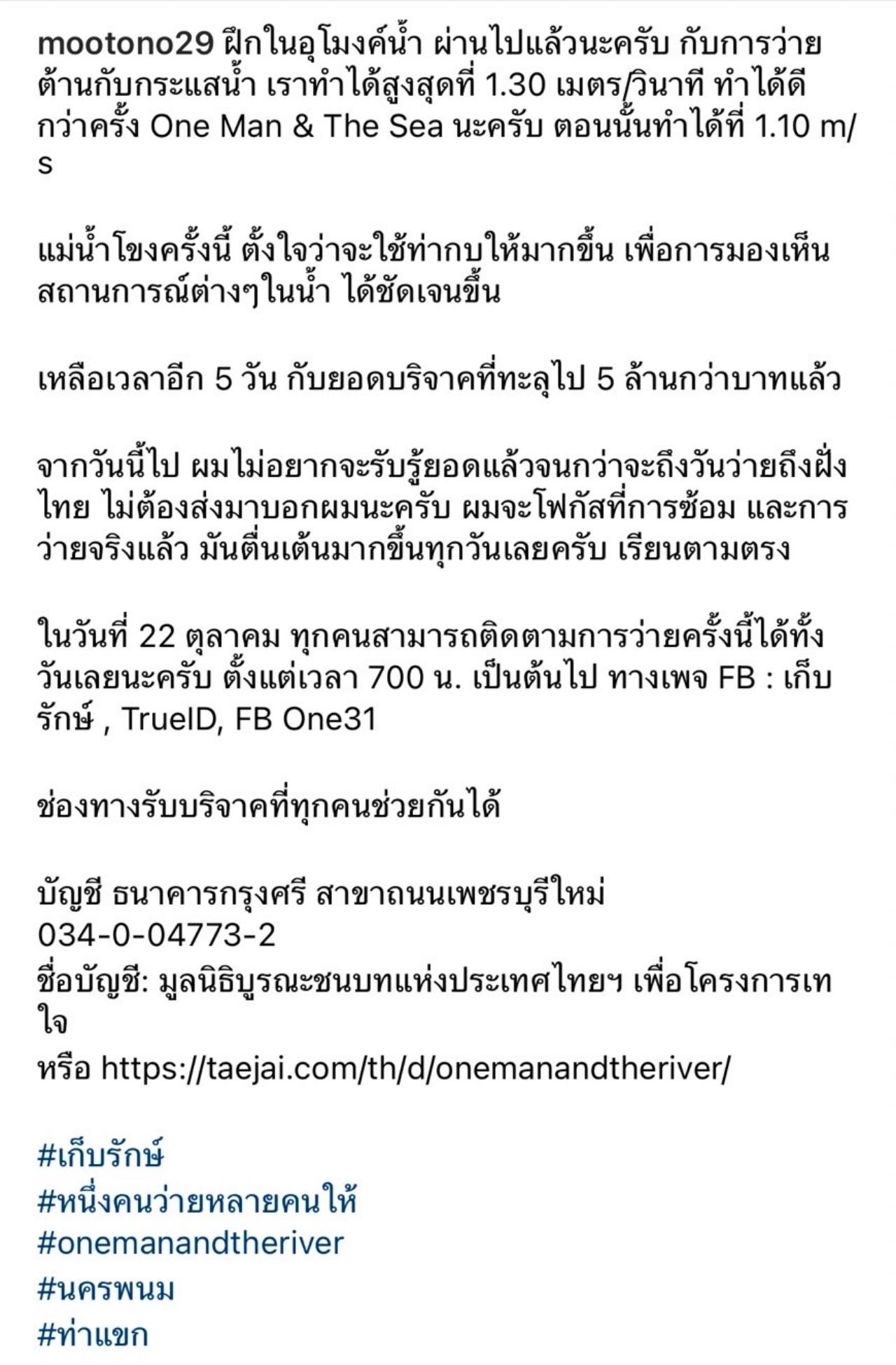 จากวันนี้ไป ผมไม่อยากจะรับรู้ยอดแล้วจนกว่าจะถึงวันว่ายถึงฝั่งไทย ไม่ต้องส่งมาบอกผมนะครับ ผมจะโฟกัสที่การซ้อม และการว่ายจริงแล้ว มันตื่นเต้นมากขึ้นทุกวันเลยครับ เรียนตามตรง