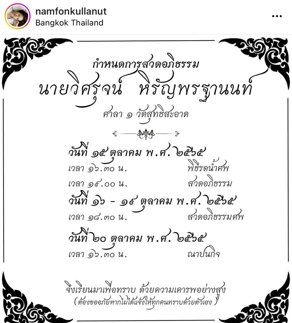 พร้อมกับได้แจ้งกำหนดการสวดอภิธรรมของพี่ชายเอาไว้ด้วยว่า "กำหนดการงานตามนี้เลยนะคะ ใครที่รู้จักพี่หมีพี่ชายของฝนเรียนเชิญด้วยนะคะ พี่หมีคงชอบที่คนมาเยอะๆ" ทางบันเทิงไทยรัฐออนไลน์ขอแสดงความเสียใจกับน้ำฝนและครอบครัวด้วยนะคะ.