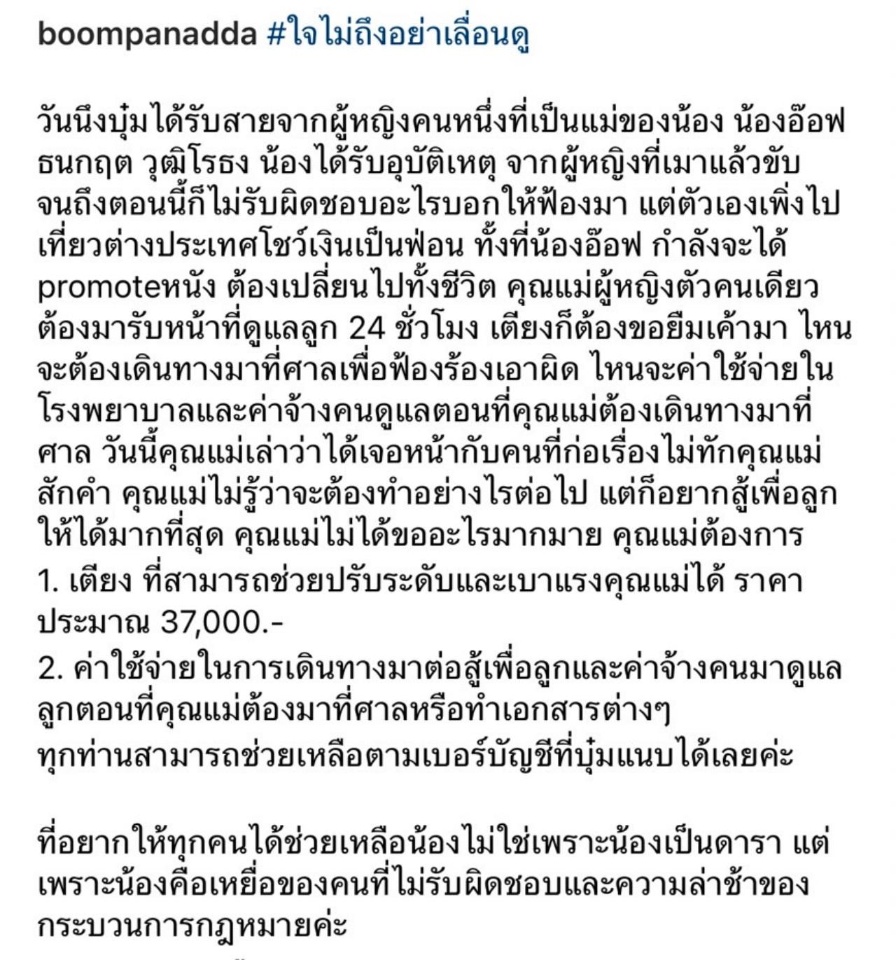 "#ใจไม่ถึงอย่าเลื่อนดู วันนึงบุ๋มได้รับสายจากผู้หญิงคนหนึ่งที่เป็นแม่ของน้อง น้องอ็อฟ ธนกฤต วุฒิโรธง น้องได้รับอุบัติเหตุจากผู้หญิงที่เมาแล้วขับ จนถึงตอนนี้ก็ไม่รับผิดชอบอะไรอบอกให้ฟ้องมา แต่ตัวเองเพิ่งไปเที่ยวต่างประเทศ โชว์เงินเป็นฟ่อน ทั้งที่น้องอ็อฟกำลังจะได้ promote หนัง ต้องเปลี่ยนไปทั้งชีวิต