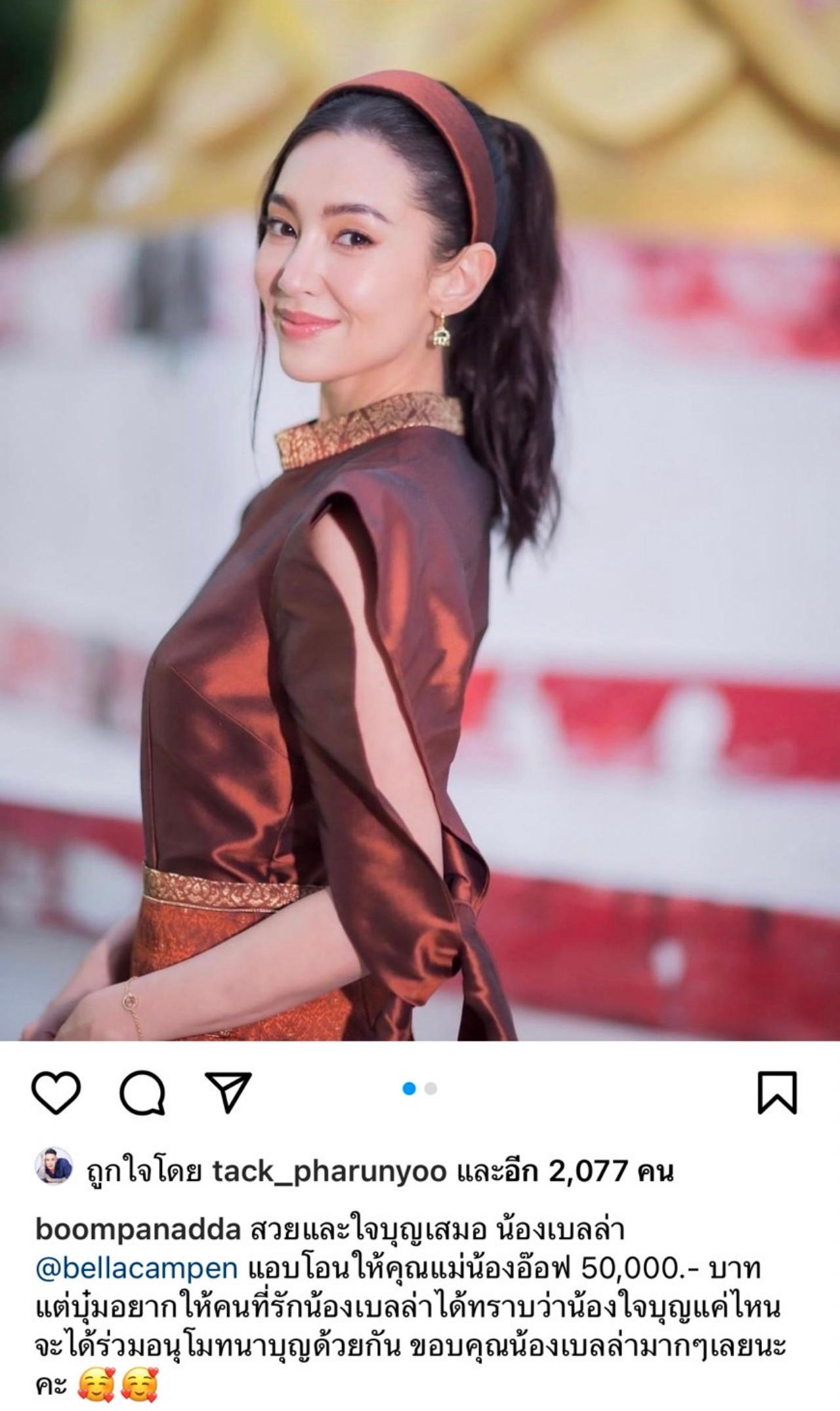ก่อนที่จะโพสต์เพิ่มเติมว่า นางเอกดัง เบลล่า ราณี ได้แอบโอนเงินให้กับคุณแม่ของ น้องอ็อฟ เป็นเงิน 5 หมื่นบาท แต่ที่ตัวเองเอามาโพสต์เพราะอยากให้แฟนคลับรู้ว่า เบลล่าใจบุญมากแค่ไหน และอยากให้แฟนๆ ร่วมอนุโมทนาบุญไปด้วยกัน.