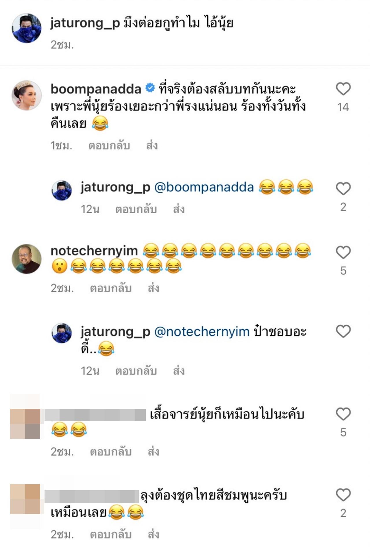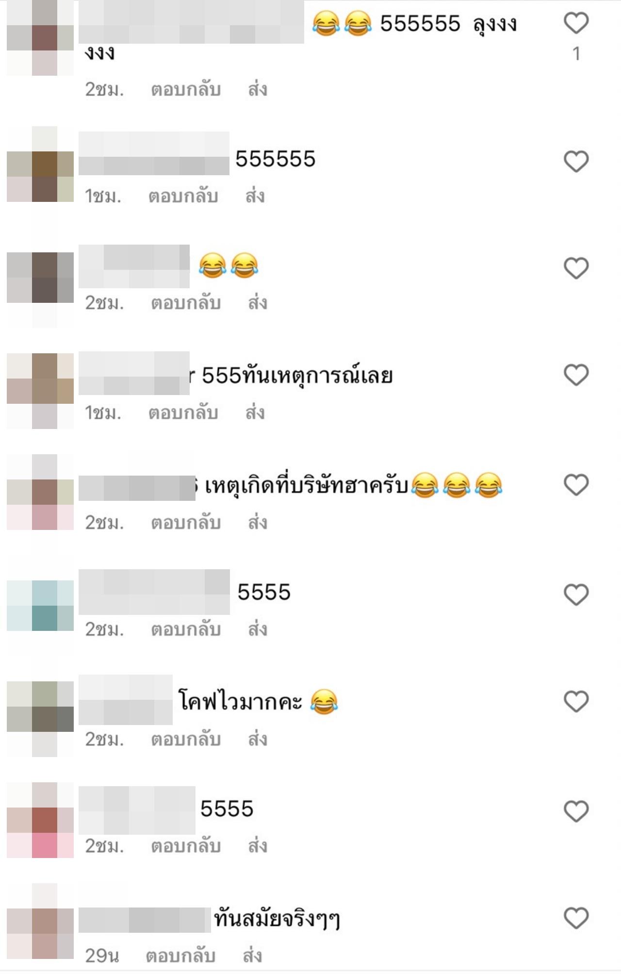 งานนี้ทำเอาแฟนๆ ที่ติดตามหลังได้เห็นคลิป ต่างเข้ามาคอมเมนต์กันแบบรัวๆ รวมไปถึงตลกรุ่นใหญ่อย่าง โน้ต เชิญยิ้ม ก็ได้คอมเมนต์เป็นอีโมจิหัวเราะจนน้ำตาไหล, บุ๋ม ปนัดดา บอกว่า ที่ต้องต้องสลับบทกันนะคะ เพราะพี่นุ้ยร้องเยอะกว่าพี่รงแน่นอน ร้องทั้งวันทั้งคืนเลย และด้านแฟนคลับคนอื่นๆ ต่างก็หัวเราะกันเป็นแถว และบอกว่า 5555สำเนาถูกต้อง, ผมหัวเราะคนเดียวลั่นห้องเลย555, 555+เป๊ะเว่อร์, โคฟไวมากค่ะ, 555ทันเหตุการณ์เลย, เหมือนจัด, ขำมาก55 เป็นต้น.