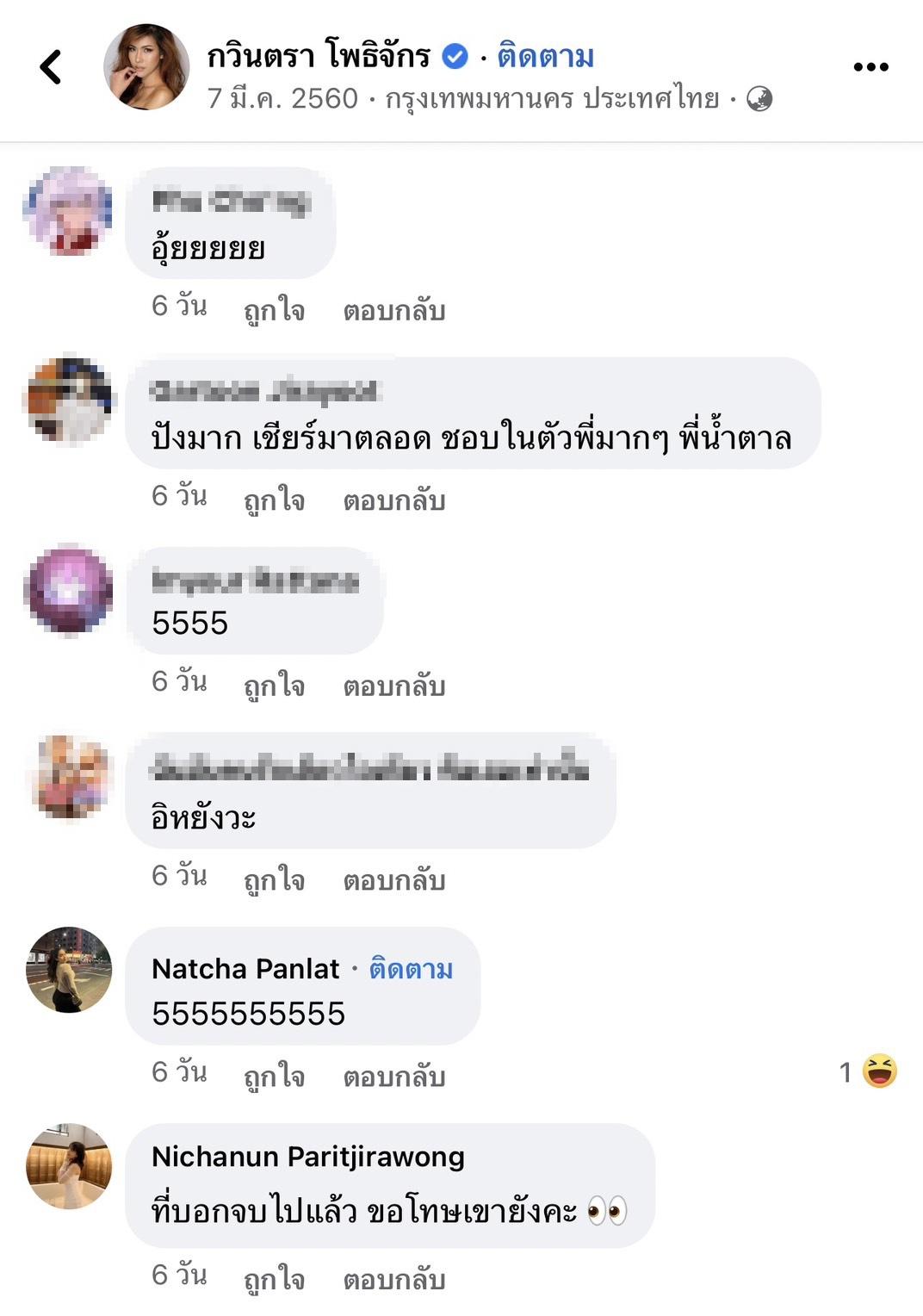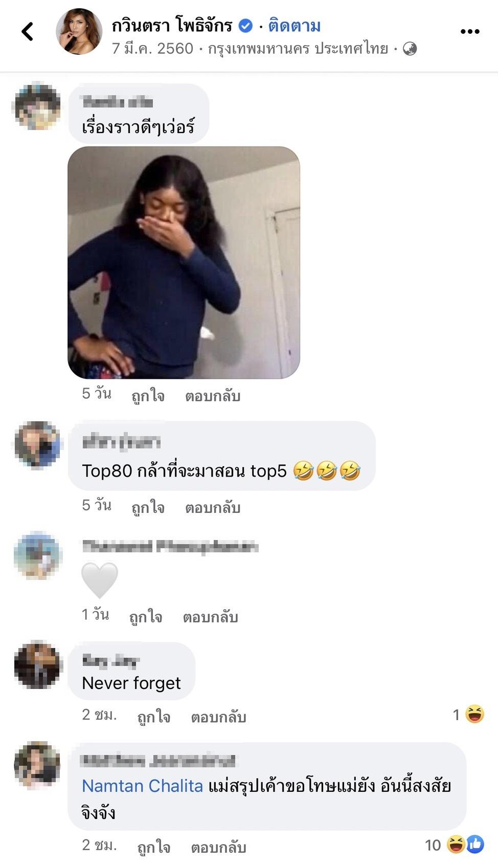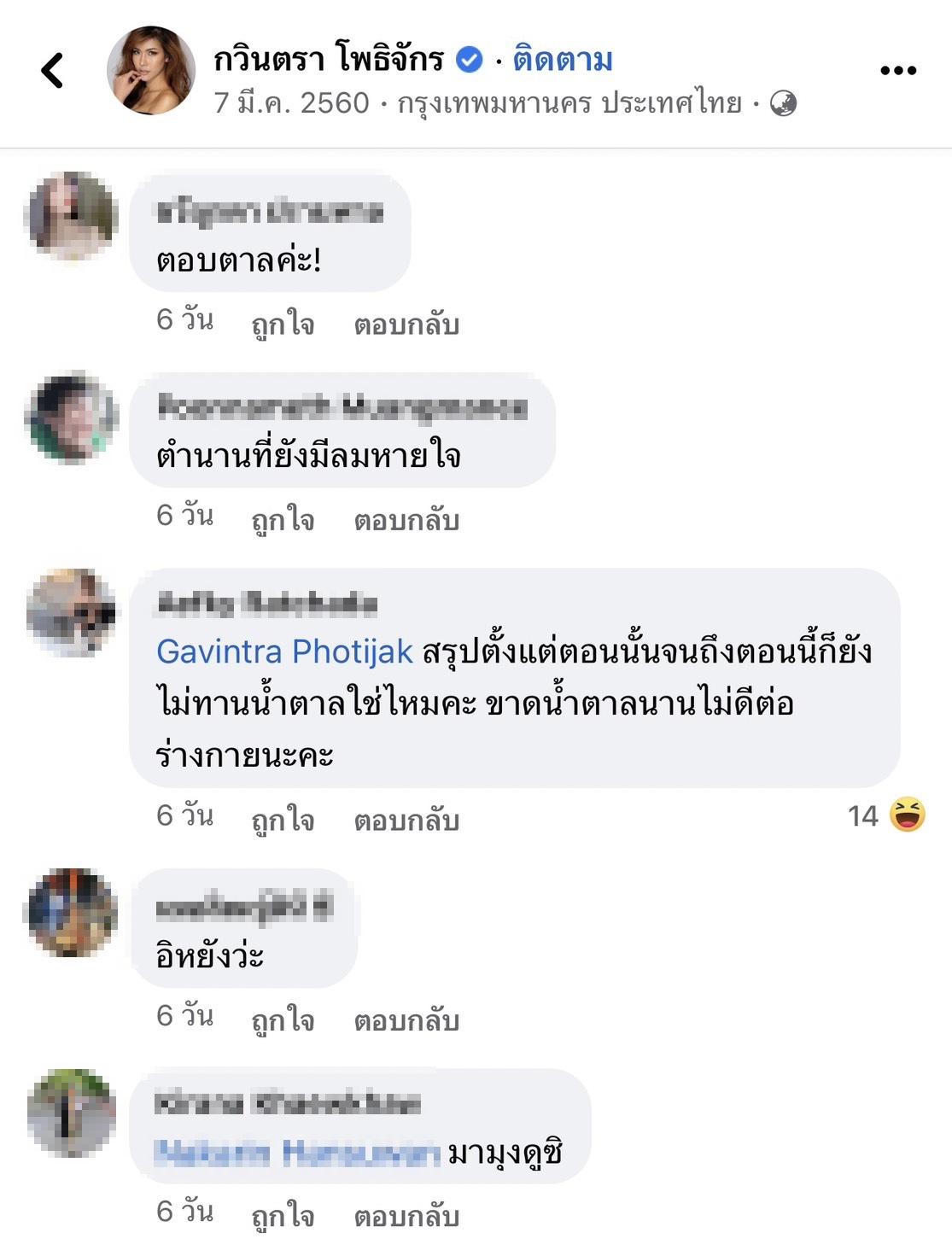 แต่ล่าสุดโพสต์ในวันนั้นของสาว แก้ม เริ่มกลับมาเป็นกระแสหน้าเฟซบุ๊กอีกครั้ง หลังมีชาวเน็ตและแฟนนางงามเข้าไปขุดและคอมเมนต์ข้อความใต้โพสต์เดิมที่เกิดปัญหา แสดงความเห็นพร้อมกับตั้งคำถามสงสัยหลายประเด็น เช่น "ใครเริ่มขุดวะ 555, โคตรบันเทิง, รีรัน, ตอบตาลค่ะ!, ตำนานที่ยังมีลมหายใจ, @Gavintra Photjak สรุปตั้งแต่ตอนนั้นจนถึงตอนนี้ก็ยังไม่ทานน้ำตาลใช่ไหมคะ ขาดน้ำตาลนานไม่ดีต่อร่างกายนะคะ