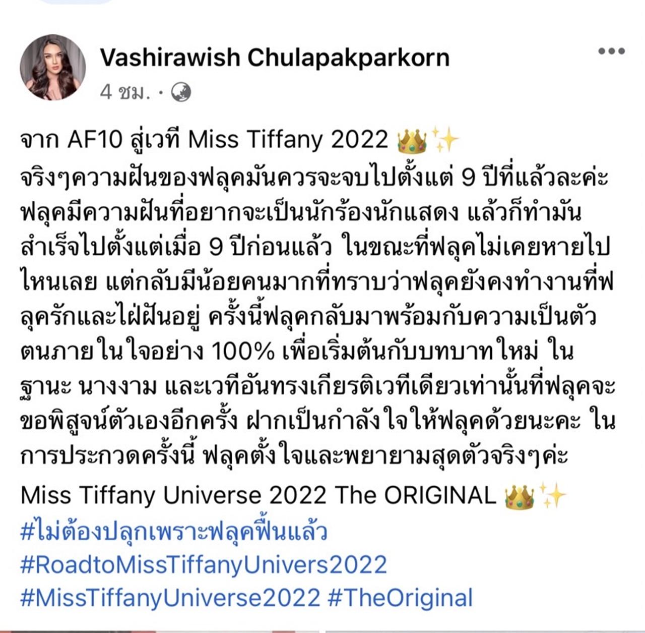 ซึ่งหนึ่งในผู้สมัครที่เปิดตัวจะชิงมงในปีนี้ก็มี ฟลุค วชิรวิชญ์ อดีตนักล่าฝันจากเวทีประกวดร้องเพลงชื่อดัง AF10 ที่ตอนนี้ได้เผยตัวตนพร้อมทำตามความฝันด้วยการลงสมัครลงเวที Miss Tiffany’s Universe 2022
