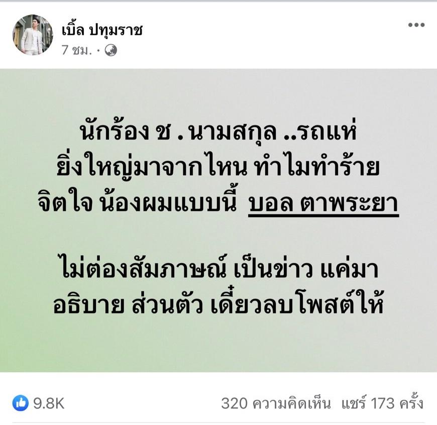 หลังจากนักร้องลูกทุ่งดัง เบิ้ล ปทุมราช โพสต์ข้อความเดือดถึงนักร้อง ช. ไว้ว่า “นักร้อง ช. นามสกุล .. รถแห่ ยิ่งใหญ่มาจากไหน ทำไมทำร้ายจิตใจ น้องผมแบบนี้ บอล ตาพระยา ไม่ต้องสัมภาษณ์เป็นข่าว แค่มาอธิบายส่วนตัว เดี๋ยวลบโพสต์ให้” และมีชาวเน็ตแสดงความคิดเห็น บ้างก็โยงไปถึง โชค รถแห่ นักร้องหนุ่มที่ก่อนหน้านี้เคยมีปัญหากับ บอล เชิญยิ้ม จนเป็นดราม่าบานปลายมาแล้ว