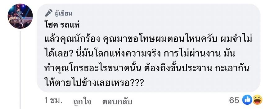 อีกทั้งยังเขียนข้อความเพิ่มเติมในคอมเมนต์ว่า “แล้วคุณนักร้อง คุณมาขอโทษผมตอนไหนครับ ผมจำไม่ได้เลย? นี่มันโลกแห่งความจริง การไม่ผ่านงาน มันทำคุณโกรธอะไรขนาดนั้น ต้องถึงขั้นประจาน กะเอากันให้ตายไปข้างเลยเหรอ???”