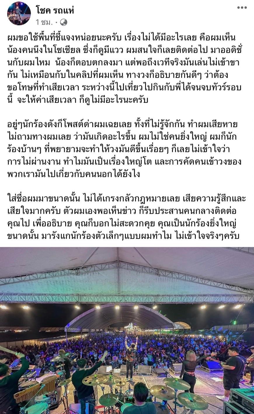 หลังจากนั้น โชค รถแห่ ก็โพสต์ข้อความเพิ่มเติมอีก โดยบอกว่า “ลำพังดราม่ารอบที่แล้ว คนก็ด่าพวกเราทั้งประเทศมากพออยู่แล้ว กว่าจะผ่านมาได้ และกว่าคนจะเข้าใจ มันไม่ง่ายเลย วันนี้ผมโดนอีกรอบ ทั้งที่ไม่ได้ไปมีเรื่องกับใคร อยู่เงียบๆ มาตลอด ทำไมคนดังๆ ใจร้ายกับผมจังครับ ปล่อยผมร้องเพลง มีความสุขกับแฟนเพลงกลุ่มเล็กๆ ของผมไม่ได้เหรอ??” โดยมีชาวเน็ตเข้ามาคอมเมนต์แสดงความคิดเห็นเป็นจำนวนมาก.