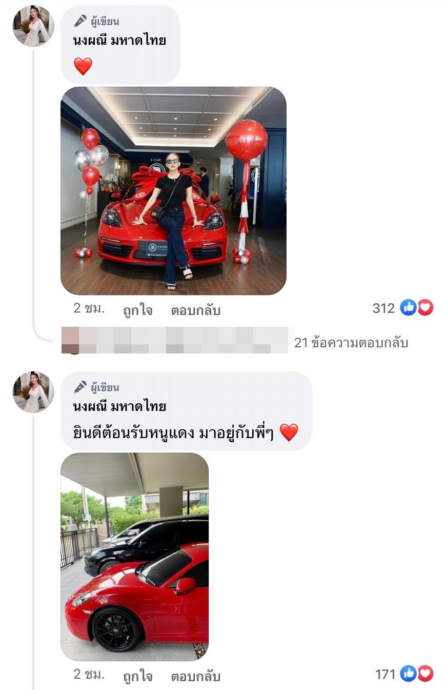 ท่ามกลางคอมเมนต์จากคนในวงการบันเทิงรวมถึงแฟนๆ ที่มาร่วมแสดงความยินดีเป็นจำนวนมาก นอกจากนี้หลายคนก็บอกว่าอยากเห็นเลขทะเบียนรถป้ายแดงของเจ้าตัวเพื่อจะนำไปเสี่ยงโชคด้วย.