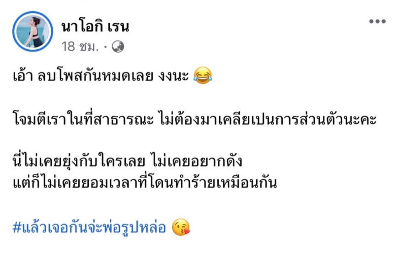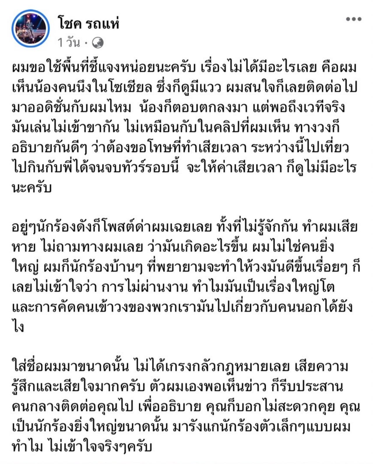 ทางด้าน โชค รถแห่ เองก็ได้โพสต์ชี้แจงในประเด็นดังกล่าว โดยบอกว่า เรื่องที่เกิดขึ้นไม่มีอะไรเลย เหตุที่น้องไม่ผ่านงานเพราะทดลองร้องร่วมกันแล้วแต่ไม่เข้าขากัน