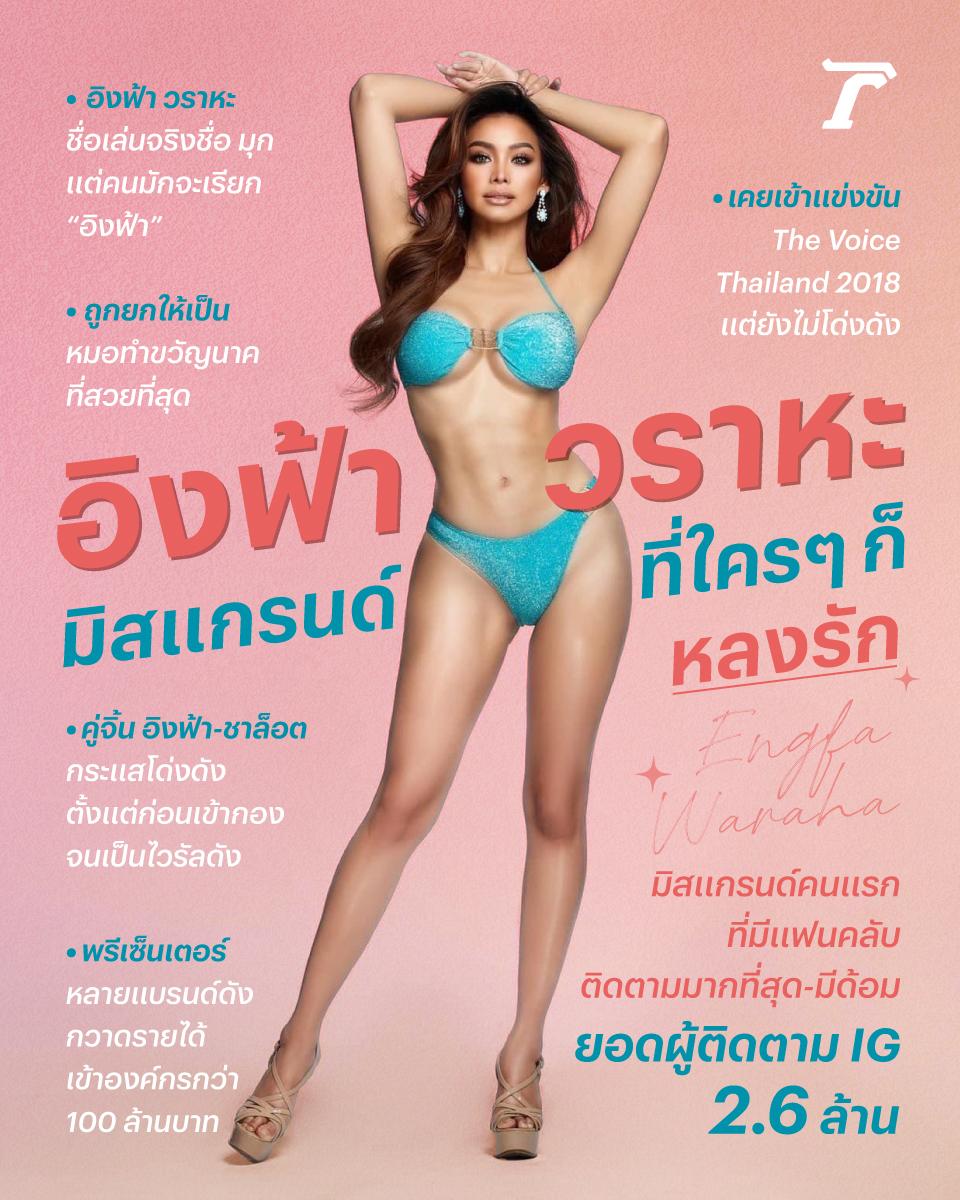 ตั้งแต่เข้ามารับตำแหน่ง Miss Grand Thailand 2022 ทำให้ชื่อของ อิงฟ้า วราหะ กลายเป็นที่รู้จักกันอย่างมาก ตั้งแต่ท่าเต้นเฉพาะตัวที่เป็นเอกลักษณ์ ไปจนถึงคู่จิ้น ชาล็อต ออสติน สาวลูกครึ่งไทย-อังกฤษ หนึ่งในผู้เข้าประกวด Miss Grand Thailand 2022 ซึ่งถือเป็นครั้งแรกของวงการนางงามที่มีคู่จิ้นเหมือนวงการอื่นๆ