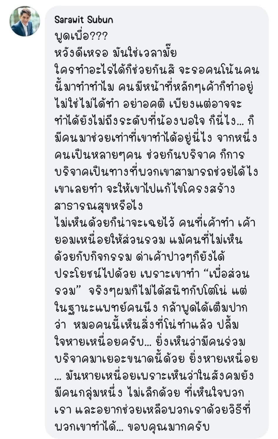 แต่ในฐานะแพทย์คนนึง กล้าพูดได้เต็มปากว่า หมอคนนี้เห็นสิ่งที่โน่ทำแล้ว ปลื้มใจหายเหนื่อยครับ... ยิ่งเห็นว่ามีคนร่วมบริจาคมาเยอะขนาดนี้ด้วย ยิ่งหายเหนื่อย... มันหายเหนื่อยเพราะเห็นว่าในสังคมยังมีคนกลุ่มหนึ่ง ไม่เล็กด้วย ที่เห็นใจพวกเรา และอยากช่วยเหลือพวกเราด้วยวิธีที่พวกเขาทำได้... ขอบคุณมากครับ".