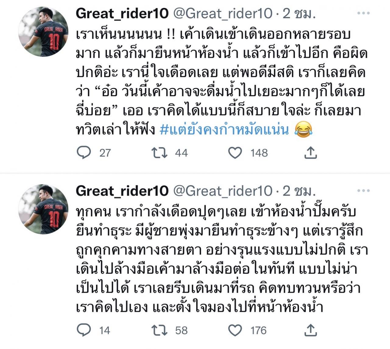 เราเห็น !! เค้าเดินเข้าเดินออกหลายรอบมาก แล้วก็มายืนหน้าห้องน้ำ แล้วก็เข้าไปอีก คือผิดปกติอ่ะ เรานี่ใจเดือดเลย แต่พอดีมีสติ เราก็เลยคิดว่า อ๋อ วันนี้เค้าอาจจะดื่มน้ำไปเยอะมากๆ ก็ได้เลยฉี่บ่อย เออ เราคิดได้แบบนี้ก็สบายใจล่ะ ก็เลยมาทวิตเล่าให้ฟัง #แต่ยังคงกำหมัดแน่น"