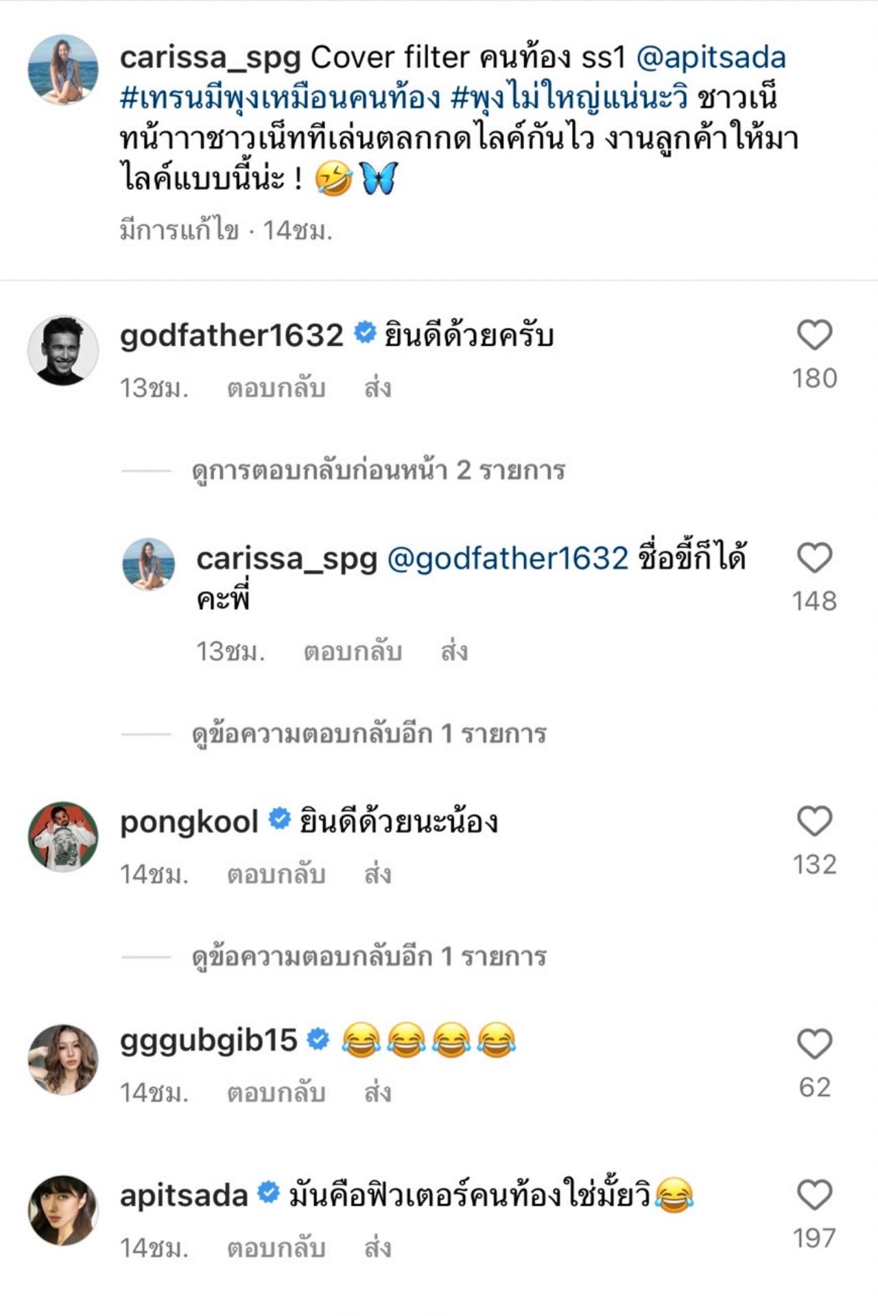 หลังจากที่ คารีสา สปริงเก็ตต์ ได้โชว์พุงป่องประกบกับว่าที่คุณแม่ ไอซ์ อภิษฎา เครือคงคา จนทำเอาแฟนๆ ต่างตกใจเพราะคิดว่าท้อง ซึ่งเจ้าตัวเองก็ได้เข้ามาคอมเมนต์ใต้ภาพของ ไอซ์ ด้วยว่า "เดี๋ยวcover ให้ดู ถ้าชาวเน็ทมาไลทเม้นถึง100 คน"