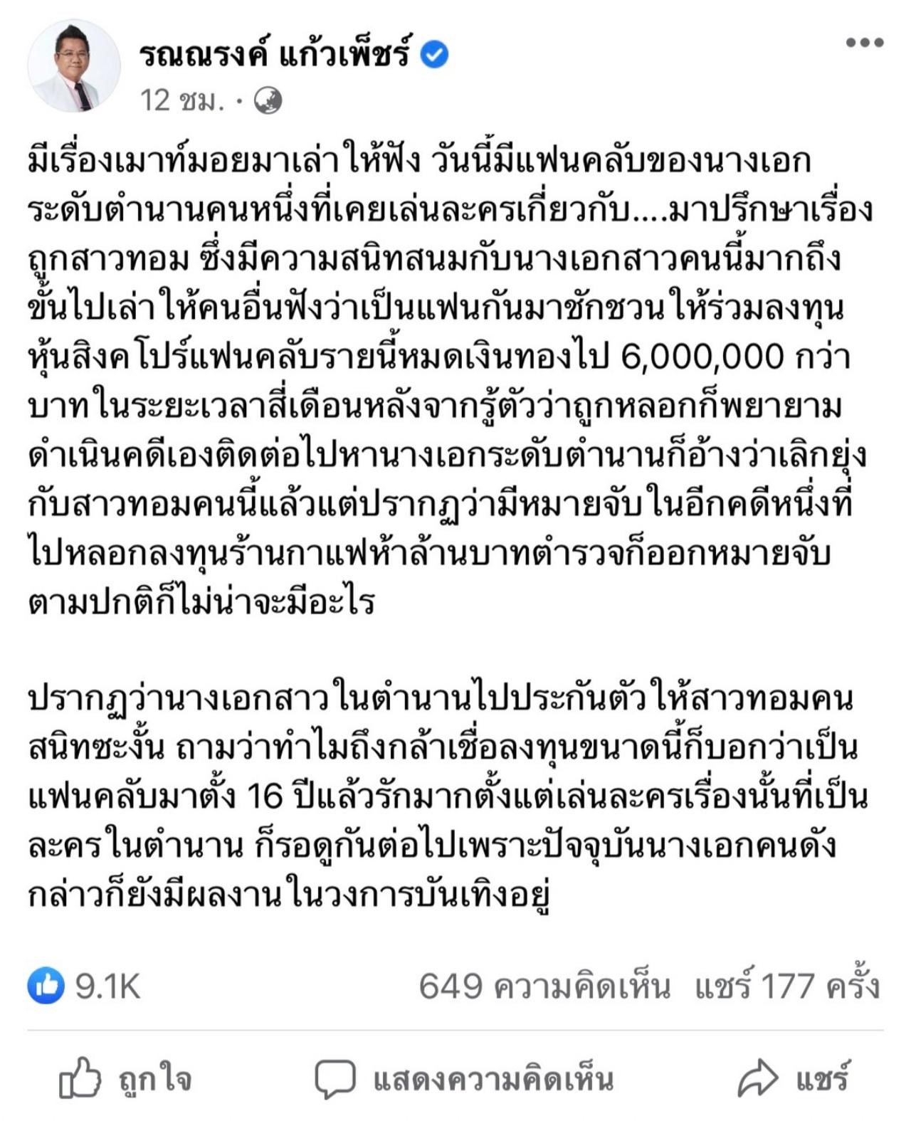 ทำเอาชาวเน็ตถึงกับอยากรู้สุดๆ เมื่อทนายรณณรงค์ แก้วเพ็ชร์ ได้โพสต์ว่ามีคนมาปรึกษาว่าถูกสาวทอมที่สนิทกับนางเอกมาชักชวนให้ไปลงทุนสูญเงินนับล้านผ่านทางเฟซบุ๊กส่วนตัว ซึ่งทนายรณณรงค์ได้เขียนข้อความไว้ว่า