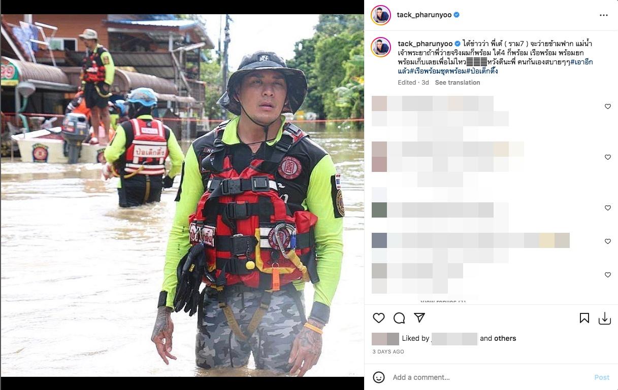 ก่อนที่ แทค ภรัณยู โรจนวุฒิธรรม นักแสดงหนุ่มชื่อดัง โพสต์ข้อความแสดงความคิดเห็นว่า “ได้ข่าวว่า พี่เต้ (ราม 7) จะว่ายข้ามฟาก แม่น้ำเจ้าพระยาถ้าพี่ว่ายจริงผมก็พร้อม ใต้ 4 ก็พร้อม เรือพร้อม พร้อมยก พร้อมเก็บเลยเผื่อไม่ไหว หวังดีนะพี่ คนกันเองสบายๆๆ #เอาอีกแล้ว #เรือพร้อมชุดพร้อม #ป่อเต็กตึ๊ง”