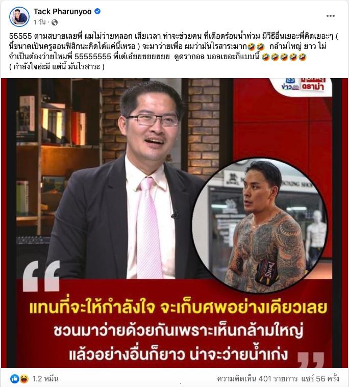 หลังจากนั้น ส.ส.เต้ ก็ได้โพสต์ข้อความชวนแทคมาว่ายน้ำด้วยกัน โดยบอกว่า "แทค น้องยังหนุ่ม อายุ 36 ปี ยาว 9" แข็งแรง กล้ามเป็นมัดแน่จริงมาว่ายน้ำข้างๆ พี่เต้ 007 หน่อย จะได้ไม่ต้องมาเก็บพี่ ปล :ผมทำประกันให้ เมีย-ลูก แล้ว" แต่งานนี้แทคก็ตอบกลับผ่านทางอินสตาแกรม @thairath ว่า "ไม่ละครับ เสียเวลา นั่งดูพี่ว่ายดีกว่า แล้วถ้าผมว่าย ใครจะเก็บพี่ละครับ"
