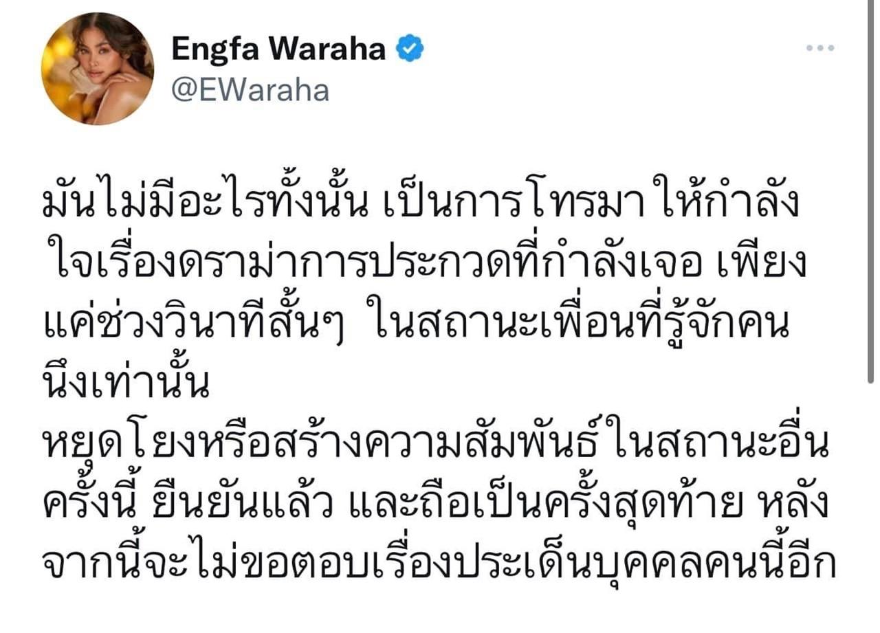 หลังจากนั้น อิงฟ้า วราหะ ก็ได้ทวีตข้อความอีกครั้งว่า "เหตุการณ์ที่เกิดขึ้น ไม่รู้ว่าต้องการอะไร แต่อย่าทำแบบนี้ ถ้าหวังดีกัน อย่าติดต่อหรือพยายามทำแบบนี้ ขอให้จบกันและฟ้ากับบุคคลดังกล่าว ไม่ได้มีส่วนเกี่ยวข้องกันต่อจากนี้" งานนี้ก็มีแฟนๆ ของ อิงฟ้า เข้ามาให้กำลังใจเจ้าตัวอย่างล้นหลาม