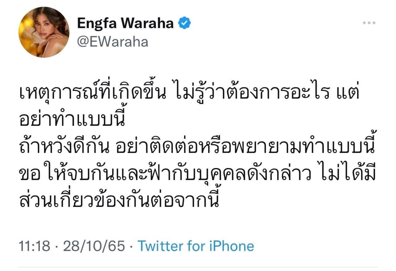 และนอกจากที่เจ้าตัวจะเจอดราม่าเรื่องดังกล่าวแล้ว ล่าสุด อิงฟ้า วราหะ ก็เจอเหตุการณ์ที่ทำให้เจ้าตัวปรี๊ดแตกและหมดความอดทน ขอออกมาปกป้องตัวเองทันที โดยอิงฟ้าได้ทวีตข้อความผ่านทวิตเตอร์ของตัวเองว่า