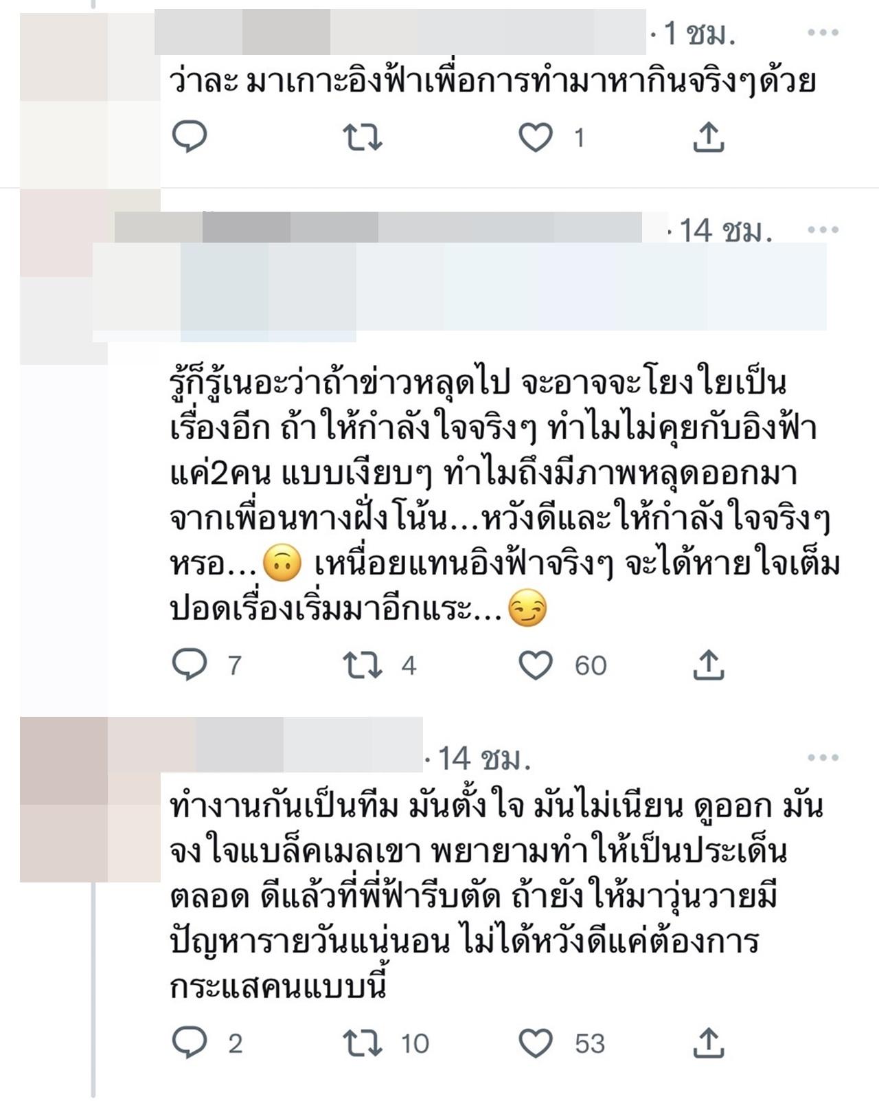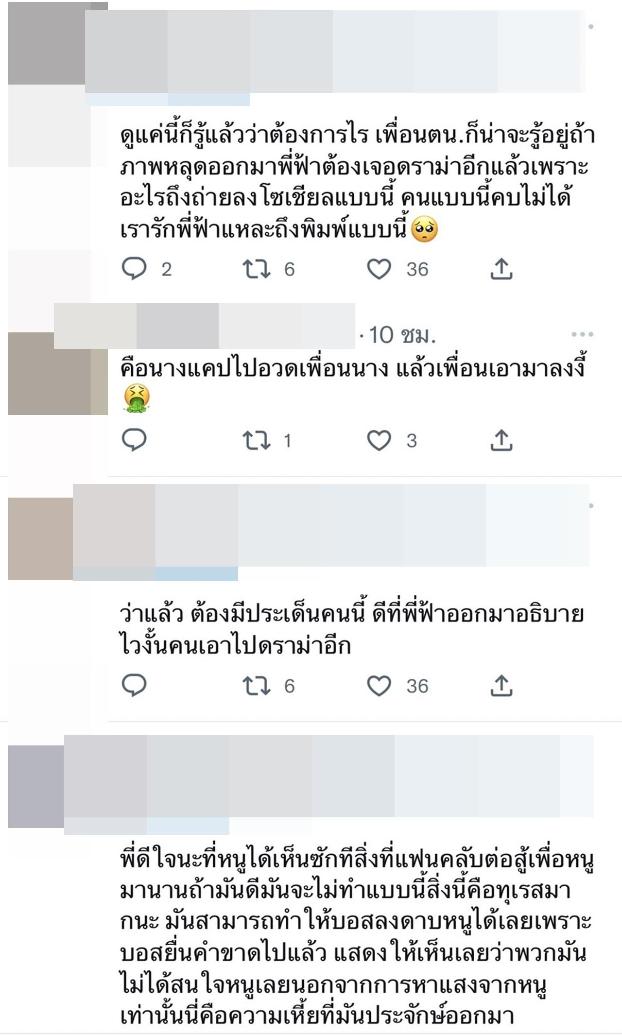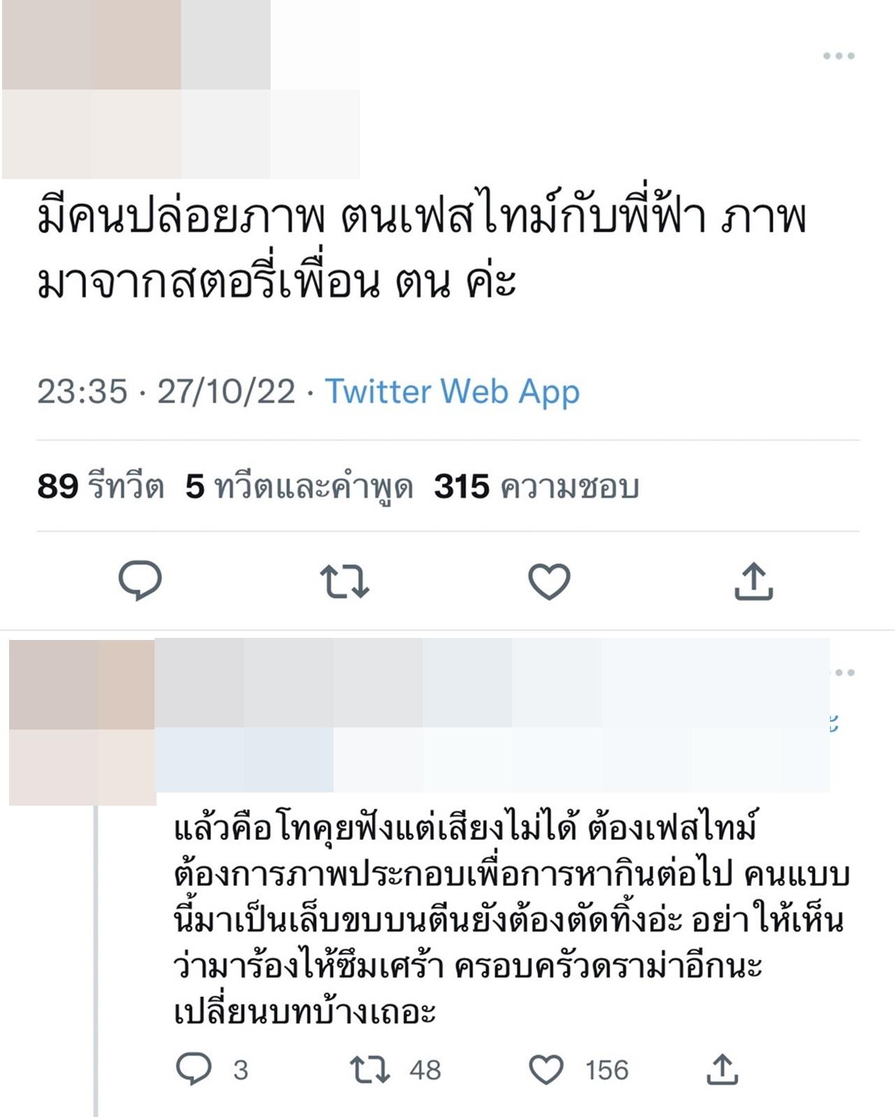 "มีคนปล่อยภาพ ตนเฟสไทม์กับพี่ฟ้า ภาพมาจากสตอรี่เพื่อน ตน ค่ะ, แล้วคือโทคุยฟังแต่เสียงไม่ได้ ต้องเฟสไทม์ต้องการภาพประกอบเพื่อการหากินต่อไป คนแบบนี้มาเป็นเล็บขบบนตีนยังต้องตัดทิ้งอ่ะ อย่าให้เห็นว่ามาร้องไห้ซึมเศร้า ครอบครัวดราม่าอีกนะ เปลี่ยนบทบ้างเถอะ,
