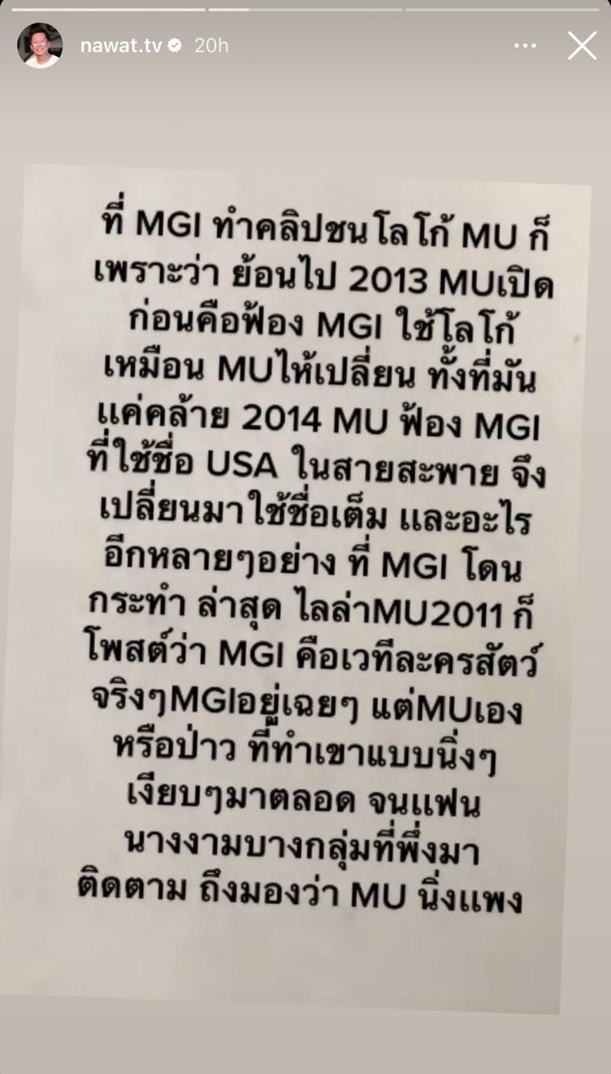 ล่าสุด ณวัฒน์ อิสรไกรศีล ผู้จัดการประกวดมิสแกรนด์อินเตอร์เนชั่นแนล ก็ได้โพสต์ไอจีสตอรี่ชี้แจงถึงกรณีดราม่าโลโก้ MGI ชนกับโลโก้ MU โดยบอกว่า “ที่ MGI ทำคลิปชนโลโก้ MU ก็เพราะว่า ย้อนไป 2013 MU เปิดก่อนคือฟ้อง MGI ใช้โลโก้เหมือน MU ให้เปลี่ยน ทั้งที่มันแค่คล้าย 2014 MU ฟ้อง MGI ที่ใช้ชื่อ USA ในสายสะพาย จึงเปลี่ยนมาใช้ชื่อเต็ม และอะไรอีกหลายๆ อย่างที่ MGI โดนกระทำ