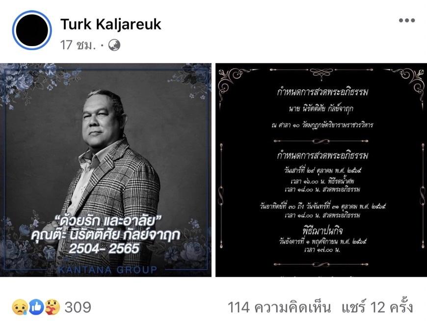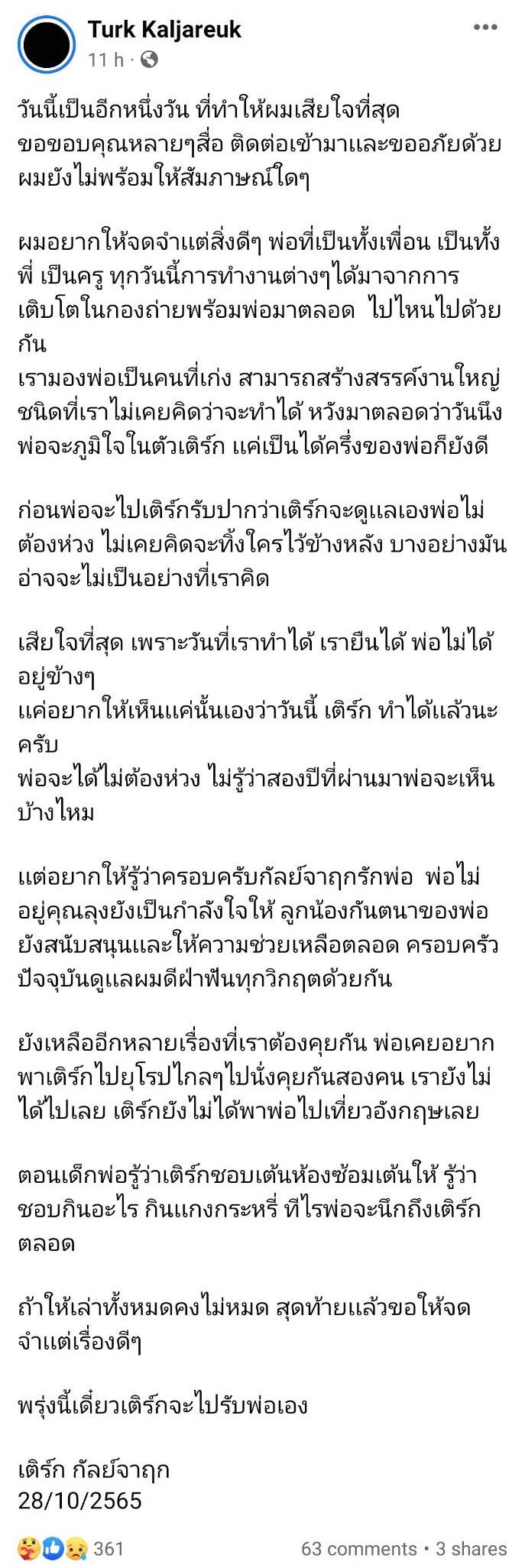 จากนั้น เติร์ก คหบดี ก็ได้โพสต์ข้อความเผยความในใจถึงคุณพ่อ โดยบอกว่า “วันนี้เป็นอีกหนึ่งวัน ที่ทำให้ผมเสียใจที่สุด ขอขอบคุณหลายๆ สื่อ ติดต่อเข้ามาและขออภัยด้วย ผมยังไม่พร้อมให้สัมภาษณ์ใดๆ
