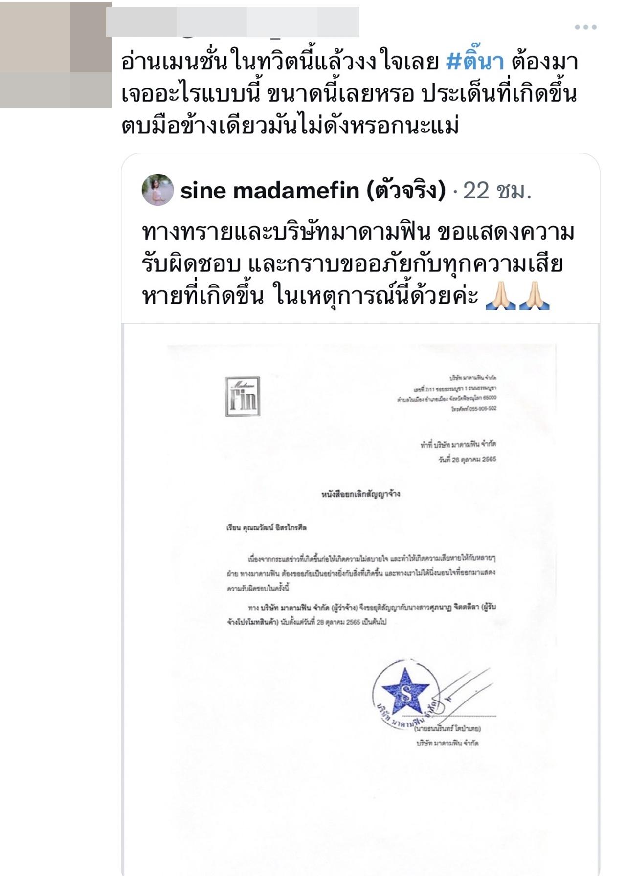 หลังจากที่มาดามฟินได้โพสต์หนังสือยกเลิกสัญญาจ้างกับทาง ติ๊นา ศุภนาฎ เป็นหนังสือถึง ณวัฒน์ อิสรไกรศีล บอสเวทีมิสแกรนด์ ซึ่งเนื้อหาในหนังสือระบุว่า