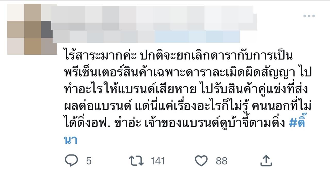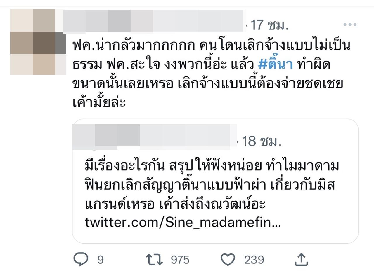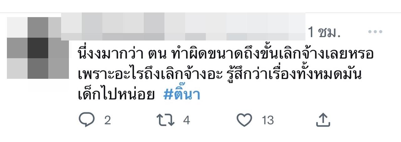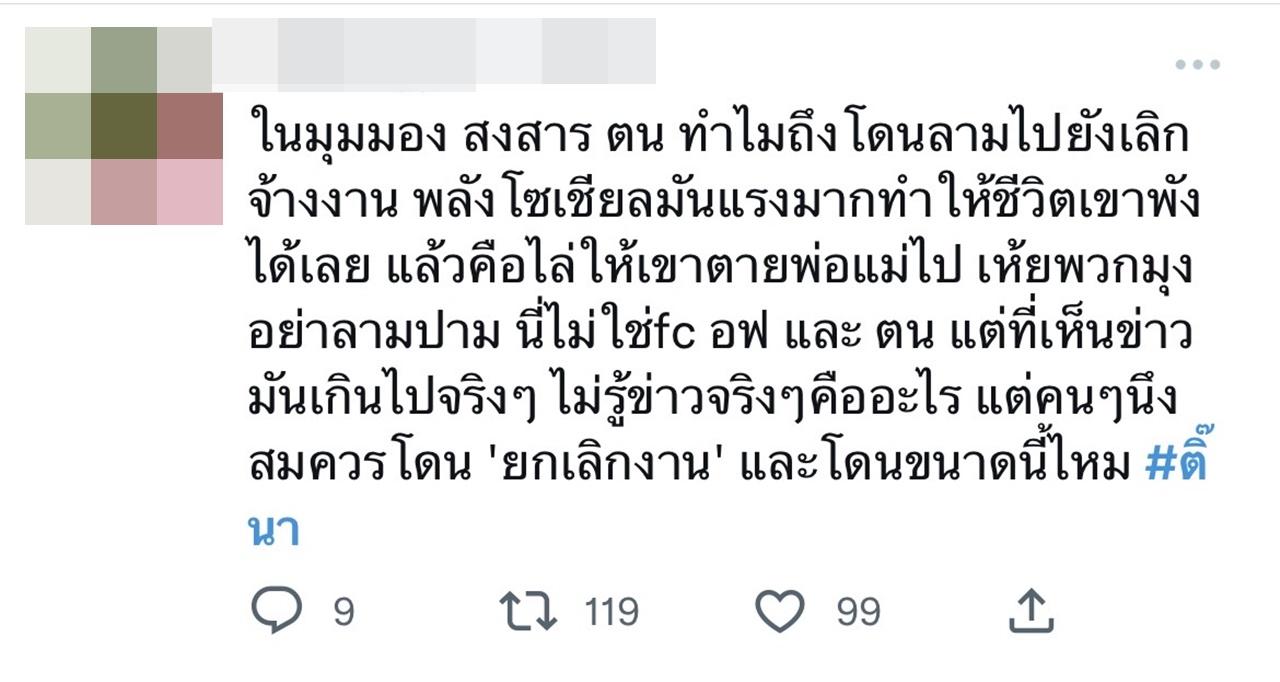 ในมุมมองสงสาร ตน ทำไมถึงโดนลามไปยังเลิกจ้างงาน หลังโซเชียลมันแรงมากทำให้ชีวิตเขาพังได้เลย แล้วคือไล่ให้เขาตายพ่อแม่ไป เห้ยพวกมุงอย่าลามปาม นี่ไม่ใช่ fc อฟ และ ตน แต่ที่เห็นข่าวมันเกินไปจริงๆ ไม่รู้ข่าวจริงๆ คืออะไร แต่คนๆ นึงสมควรโดน 'ยกเลิกงาน' และโดนขนาดนี้ไหม #ติ๊นา"