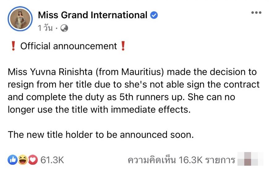 และมิสแกรนด์มอริเชียสก็ได้เขียนแคปชั่นว่า “Repost from @miss_grand_mauritius The post being published of @missgrandinternational is not correct. Miss Grand Mauritius was given this contract to sign yet we did not agree to it and did not sign anything. Our Queen @yuvrnt resigned personally due to not being aligned with @missgrandinternational latest behaviour with our organisation and others. So we request @missgrandinternational to stop publishing these fake news. Here is the full picture of the contract without any signature of our Queen @yuvrnt”