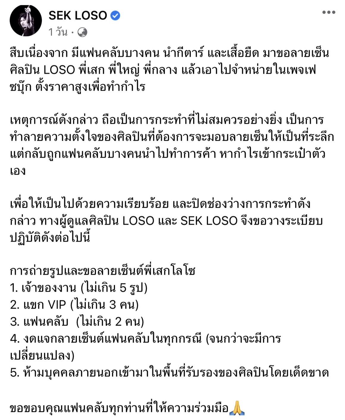 "สืบเนื่องจาก มีแฟนคลับบางคน นำกีตาร์ และเสื้อยืด มาขอลายเซ็นศิลปิน LOSO พี่เสก พี่ใหญ่ พี่กลาง แล้วเอาไปจำหน่ายในเพจเฟซบุ๊ก ตั้งราคาสูงเพื่อทำกำไร ซึ่งเหตุการณ์ดังกล่าว ถือเป็นการกระทำที่ไม่สมควรอย่างยิ่ง เป็นการทำลายความตั้งใจของศิลปินที่ต้องการจะมอบลายเซ็นให้เป็นที่ระลึก