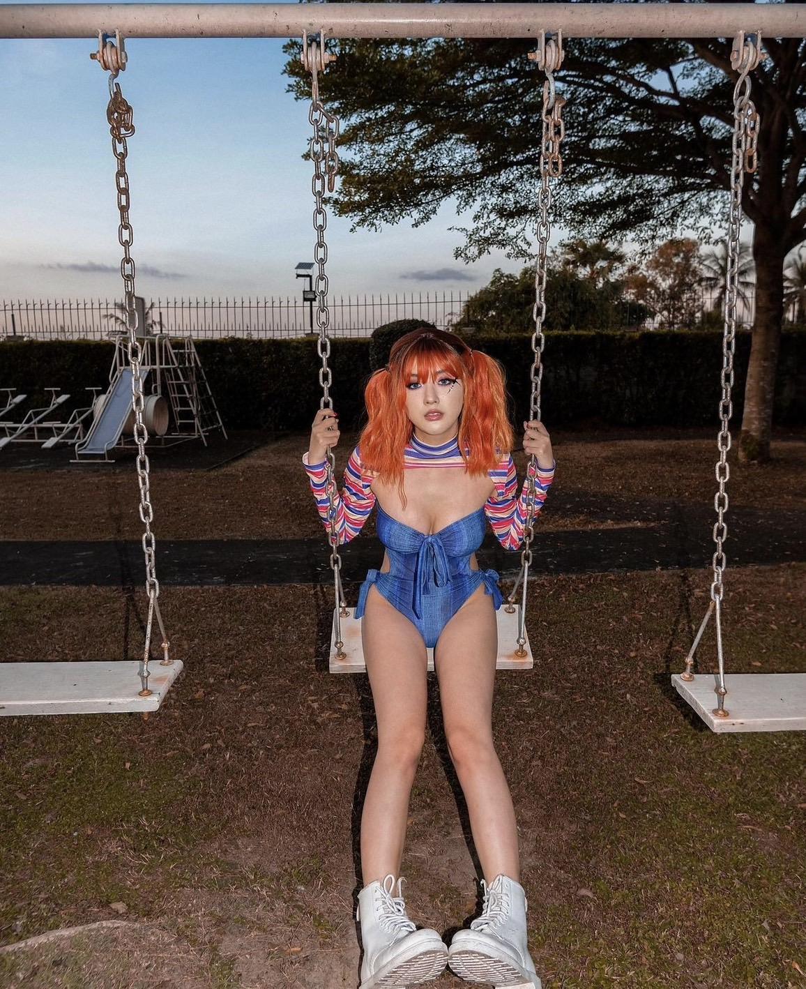 ซึ่งฮาโลวีนปี 2022 นี้ นักร้องคนดังอย่างสาว เบียร์ ภัสรนันท์ หรือ เบียร์ เดอะวอยซ์ ขาประจำตัวแม่เรื่องคอนเทนต์ความเซ็กซี่ ก็ไม่พลาดออกมาจัดเต็มในเทศกาลวันฮาโลวีนแบบนี้ แต่ถึงอย่างไรเธอยังคงคอนเซปต์เรื่องความแซ่บเอาไว้อยู่ โดยรอบนี้ขอแต่งเป็นผีชัคกี้ มาในชุดว่ายน้ำดันอก เห็นทรวดทรงชัดเจน เซ็กซี่สุดๆ ไปเลย