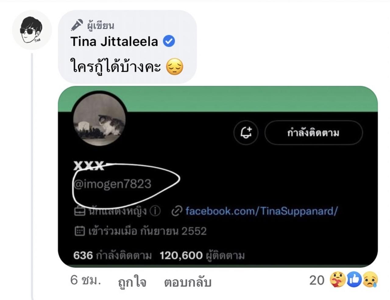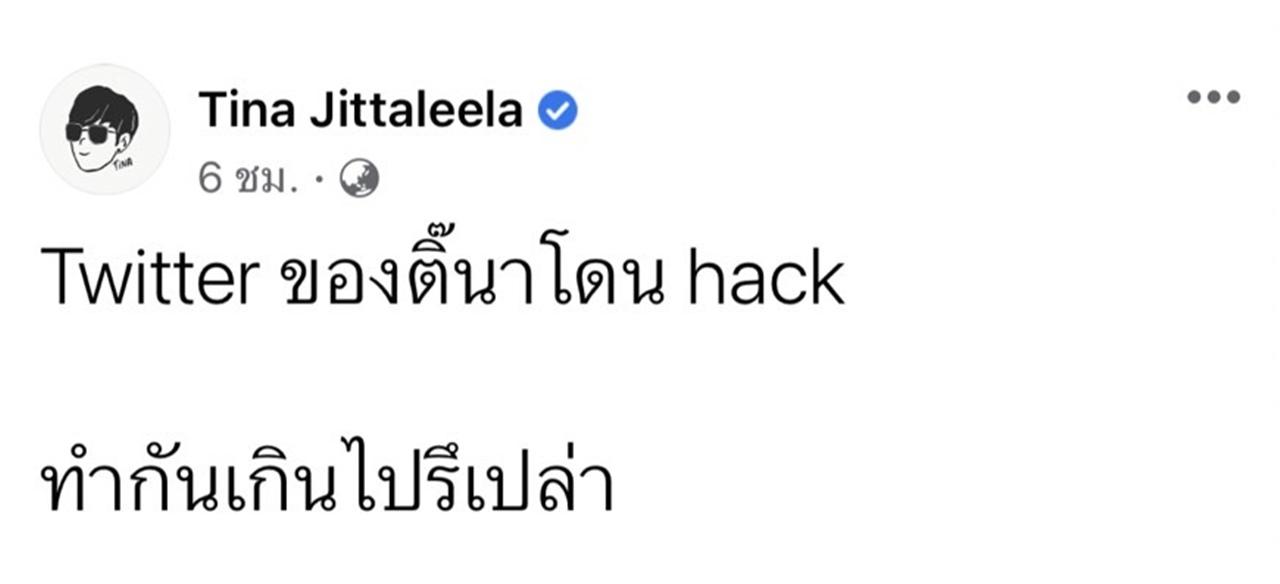 แต่ล่าสุด เจ้าตัวก็ได้โพสต์ข้อความผ่านเฟซบุ๊ก Tina Jittaleela โดยบอกว่า "Twitter ของติ๊นาโดน hack ทำกันเกินไปรึเปล่า" จากนั้นก็ได้แคปหน้าทวิตเตอร์ที่โดนแฮก พร้อมกับถามว่า "ใครกู้ได้บ้างคะ"