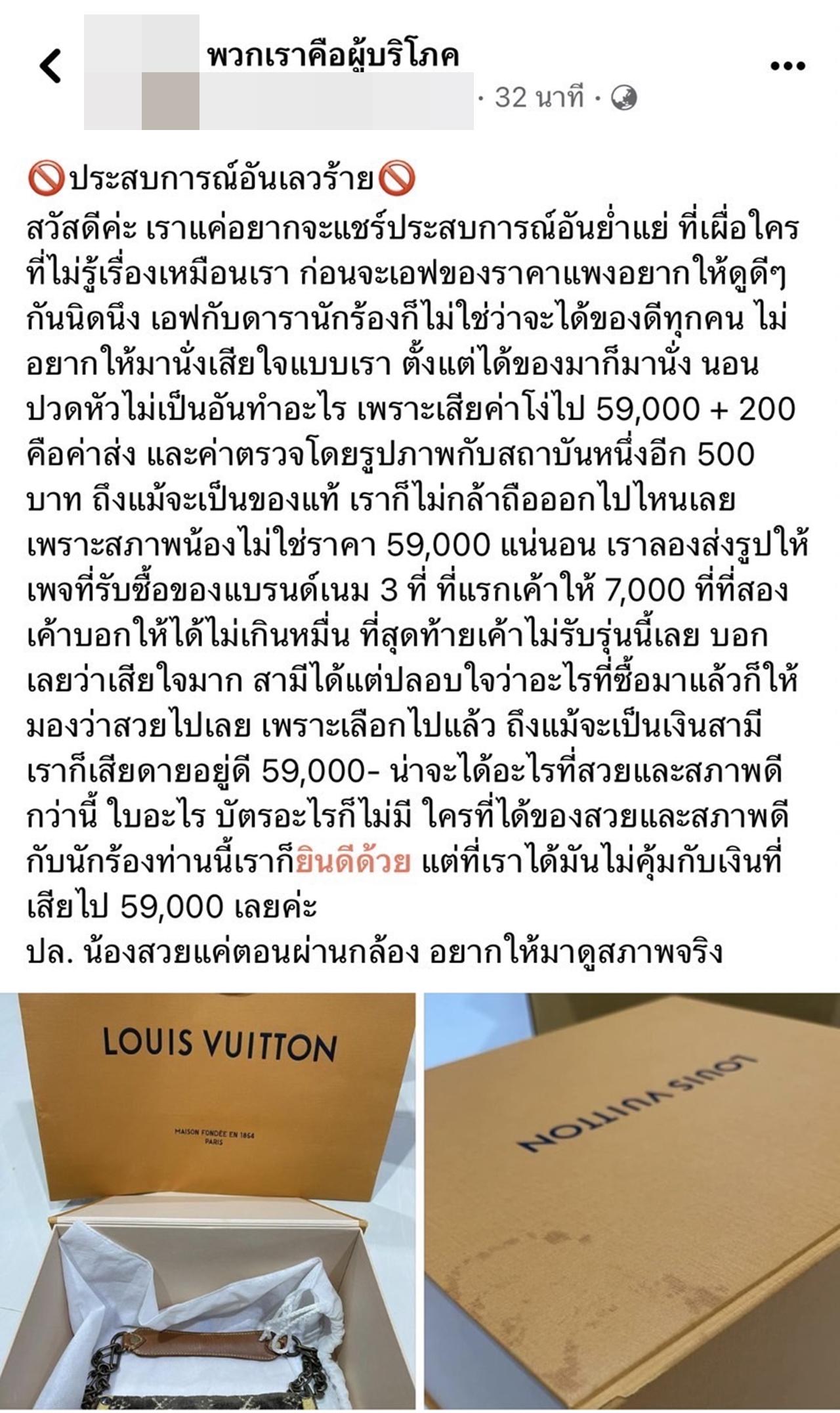 เราลองส่งรูปให้เพจที่รับซื้อของแบรนด์เนม 3 ที่ ที่แรกเขาให้ 7,000 ที่ที่สองเขาบอกให้ได้ไม่เกินหมื่น ที่สุดท้ายเค้าไม่รับรุ่นนี้เลย บอกเลยว่าเสียใจมาก สามีได้แต่ปลอบใจว่าอะไรที่ซื้อมาแล้วก็ให้มองว่าสวยไปเลย เพราะเลือกไปแล้ว ถึงแม้จะเป็นเงินสามี เราก็เสียดายอยู่ดี 59,000 บาท น่าจะได้อะไรที่สวยและสภาพดีกว่านี้ ใบอะไร บัตรอะไรก็ไม่มี ใครที่ได้ของสวยและสภาพดีกับนักร้องท่านนี้เราก็ยินดีด้วย แต่ที่เราได้มันไม่คุ้มกับเงินที่เสียไป 59,000 เลยค่ะ"