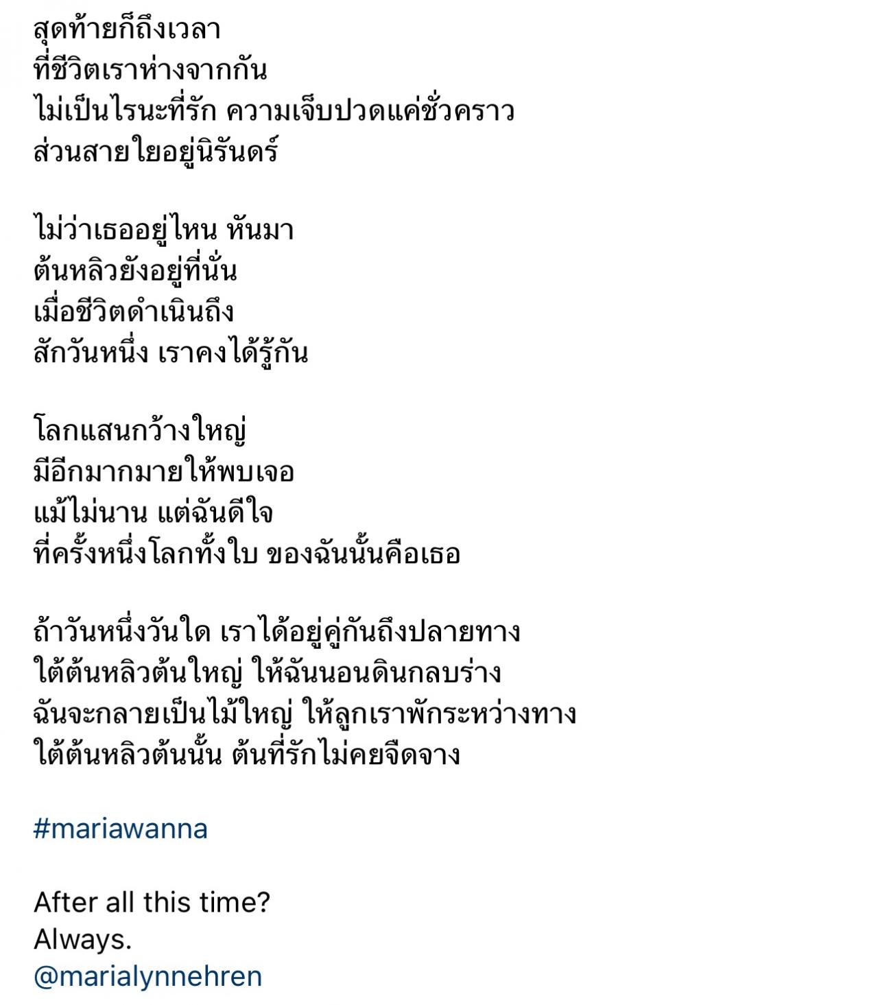 หลังจากนั้นทางด้าน มารีญา ได้โพสต์รูปคู่พร้อมข้อความสั้นๆว่า "Thank you for everything :) #Bffs4Life" (ขอบคุณสำหรับทุกอย่าง #เพื่อนที่ดีสุดตลอดกาล)