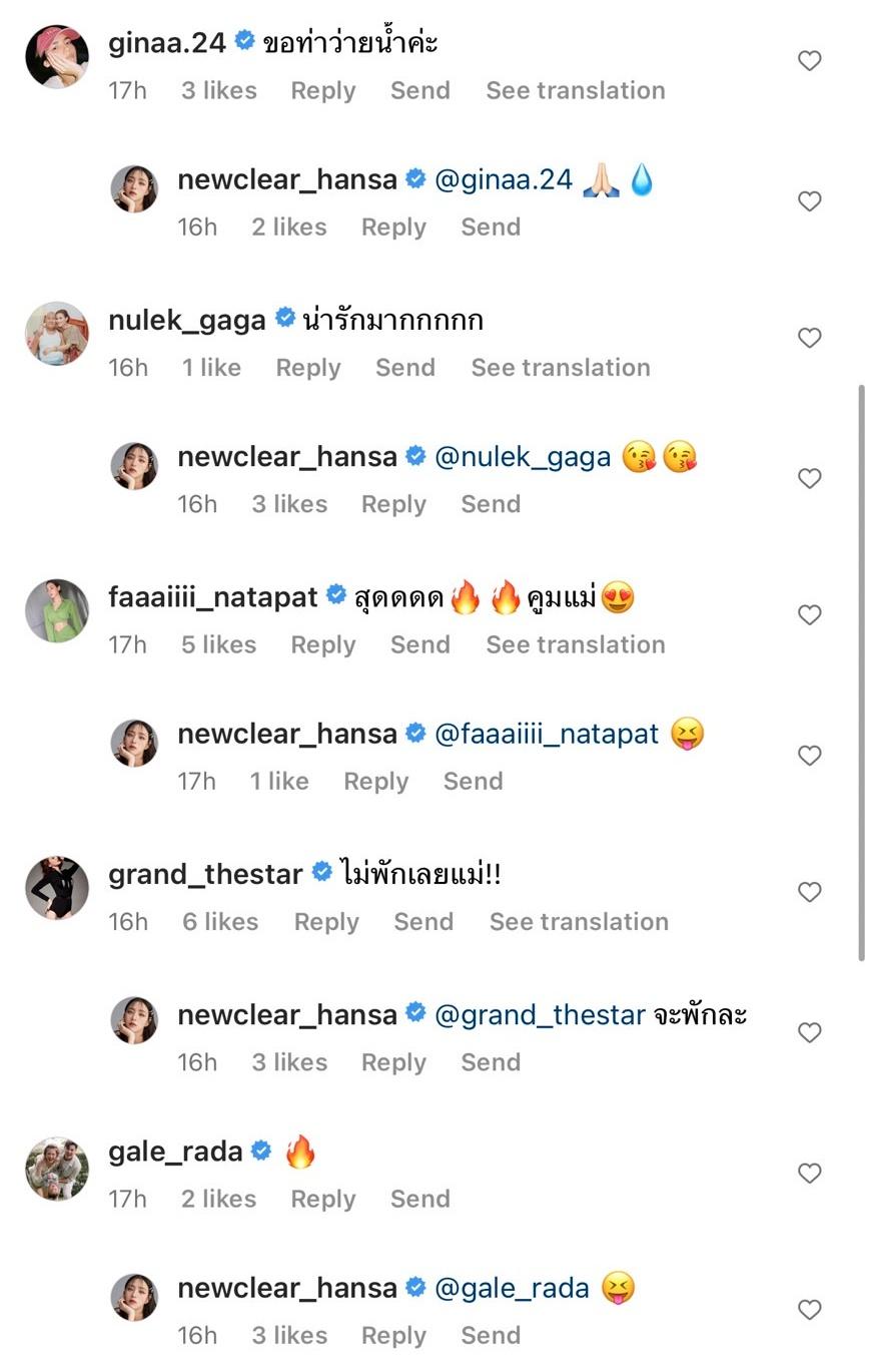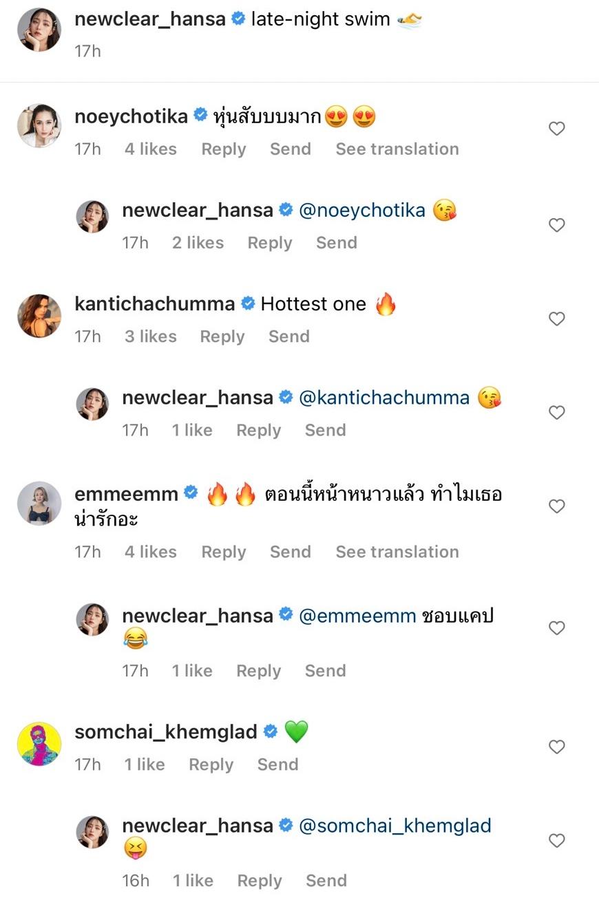 ท่ามกลางคอมเมนต์จากแฟนๆ รวมถึงเพื่อนๆ ในวงการบันเทิง อาทิ เนย โชติกา “หุ่นสับบบมาก”, ติช่า กันติชา “Hottest one”, เอ็ม บุษราคัม “ตอนนี้หน้าหนาวแล้ว ทำไมเธอน่ารักอะ”, เต๋า สมชาย ส่งอีโมจิหัวใจสีเขียว, จีน่า วิรายา “ขอท่าว่ายน้ำค่ะ”, หนูเล็ก ก่อนบ่าย “น่ารักมากกกกก” ฯลฯ