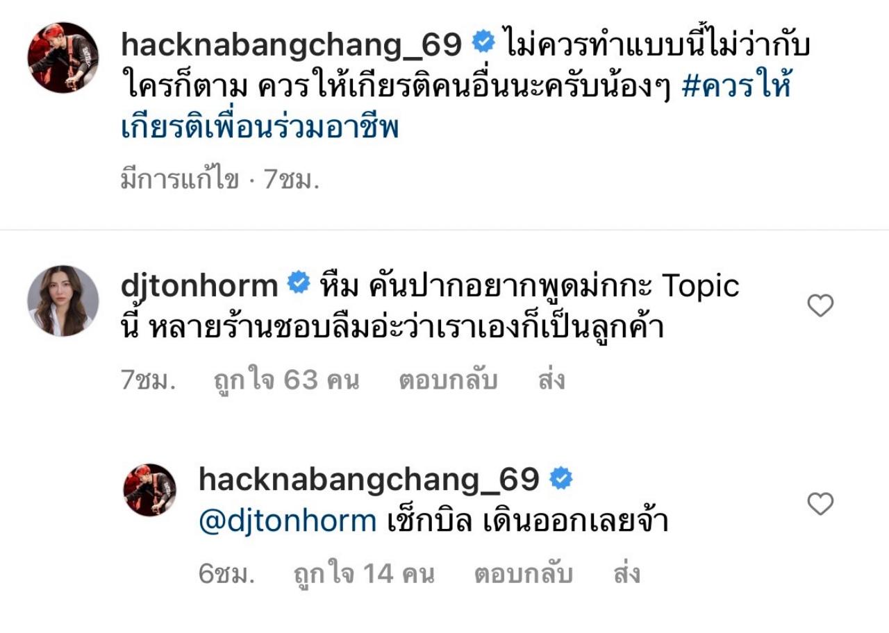 นอกจากนี้ แฮ็ค วงแคลช ยังได้โพสต์ข้อความและเขียนแคปชั่นในอินสตาแกรมว่า “ไม่ควรทำแบบนี้ไม่ว่ากับใครก็ตาม ควรให้เกียรติคนอื่นนะครับน้องๆ #ควรให้เกียรติเพื่อนร่วมอาชีพ”