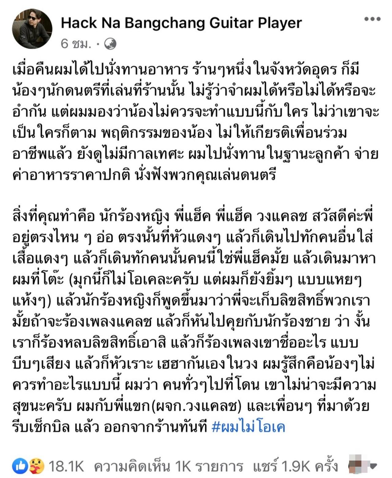 “เมื่อวานผมได้ไปทานอาหาร ร้านๆ หนึ่งในจังหวัดอุดร ก็มีน้องๆ นักดนตรีที่เล่นที่ร้านนั้น ไม่รู้ว่าจำผมได้หรือไม่ได้หรือจะอำกัน แต่ผมมองว่าน้องไม่ควรจะทำแบบนี้กับใครแบบนั้น ไม่ว่าเขาจะเป็นใครก็ตาม พฤติกรรมของน้อง ไม่ให้เกียรติเพื่อนร่วมอาชีพแล้ว ยังดูไม่มีกาลเทสะ ผมไปนั่งทานในฐานะลูกค้า จ่ายค่าอาหารราคาปกติ นั่งฟังพวกคุณเล่นดนตรี