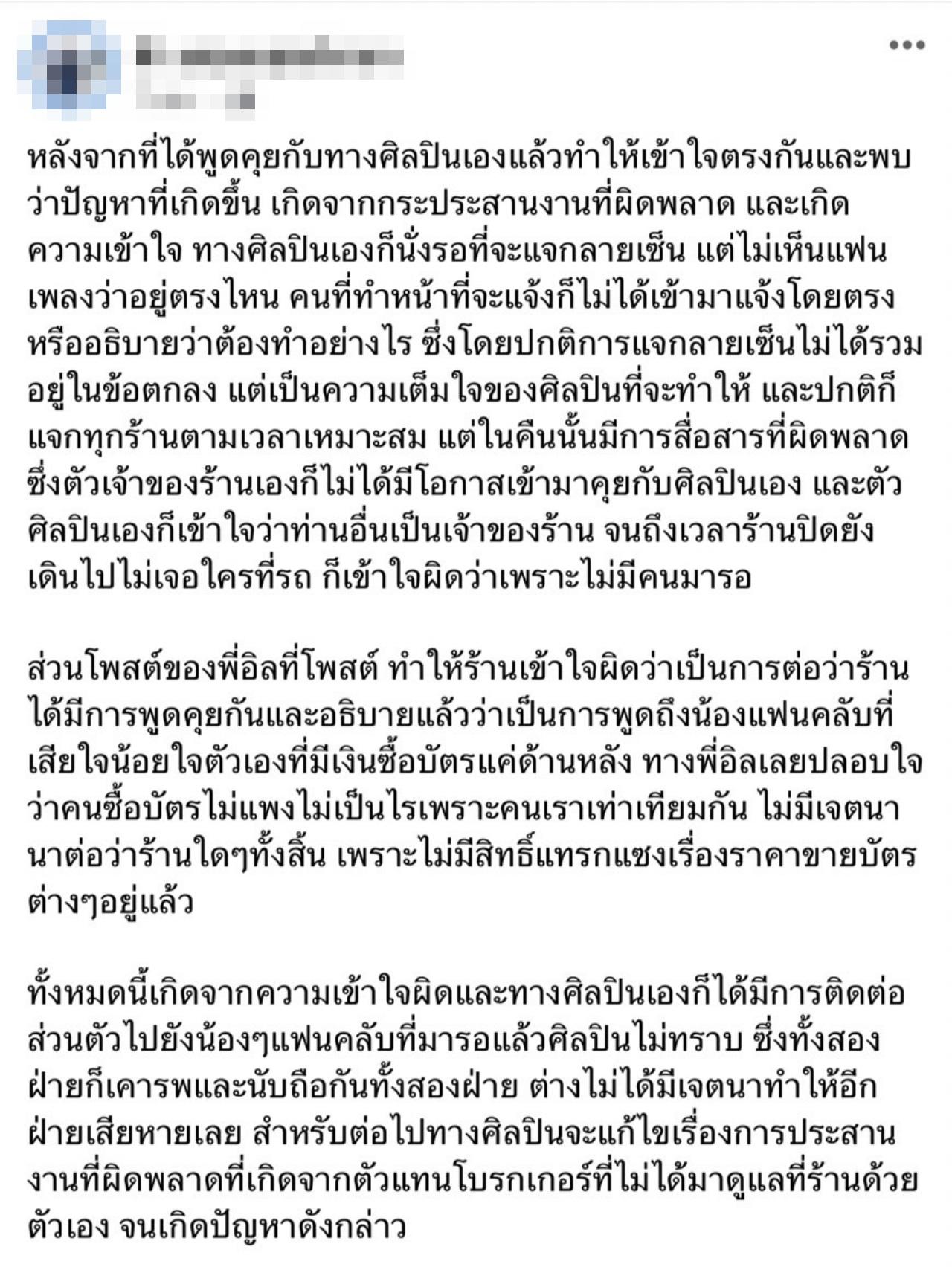 "ผมขอบคุณพี่เจ้าของร้านมากๆ ครับที่เข้าใจ เรื่องที่เกิดขึ้นเกิดจากความเข้าใจผิด แต่หลังจากที่คุยกัน ทำให้ผมเข้าใจว่าอารมณ์ที่เกิดขึ้นเกิดจากจุดประสงค์เดียวกันที่ตรงกับผม คือพี่เจ้าของร้านเองก็ต้องการให้คนฟังของผมได้รับสิ่งที่ดีที่สุดเหมือนกันกับผม