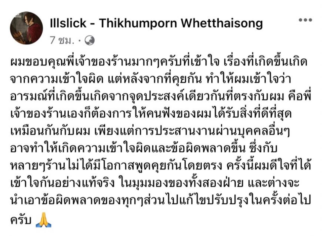 หลังจากเกิดประเด็นดราม่า เมื่อเจ้าของร้านได้โพสต์ข้อความถึงการจ้างนักร้องดังที่เรียกตัวเองว่านักกวี และเพิ่งมีประเด็นเมื่อไม่นานมานี้ มาทำการแสดงที่ร้าน แต่กลับเกิดปัญหาตามมา เนื่องจากไม่ทำตามข้อตกลง ซึ่งเรื่องดังกล่าวกลับกลายเป็นหนังคนละม้วน เพราะเกิดจากความเข้าใจผิด ด้านเจ้าของร้านเองก็ได้โพสต์ขอโทษ Illslick (อิลสลิก) หรือ โต้ง ทิฆัมพร เวชไทยสงค์ แร็ปเปอร์ชื่อดัง โดยบอกว่า ได้เคลียร์กันแล้ว ทำให้ทราบว่า ปัญหาที่เกิดขึ้นนั้นเกิดจากการประสานงานผิดพลาดนั่นเอง